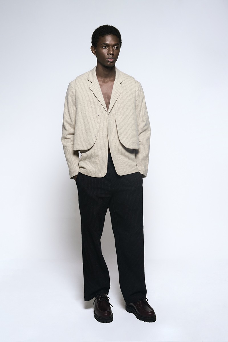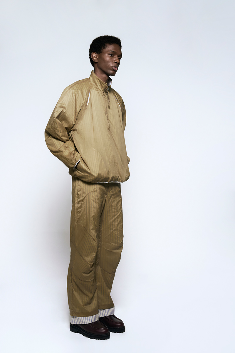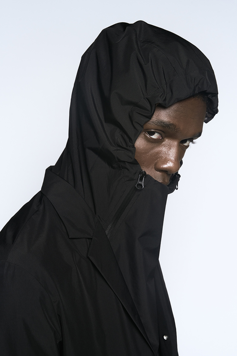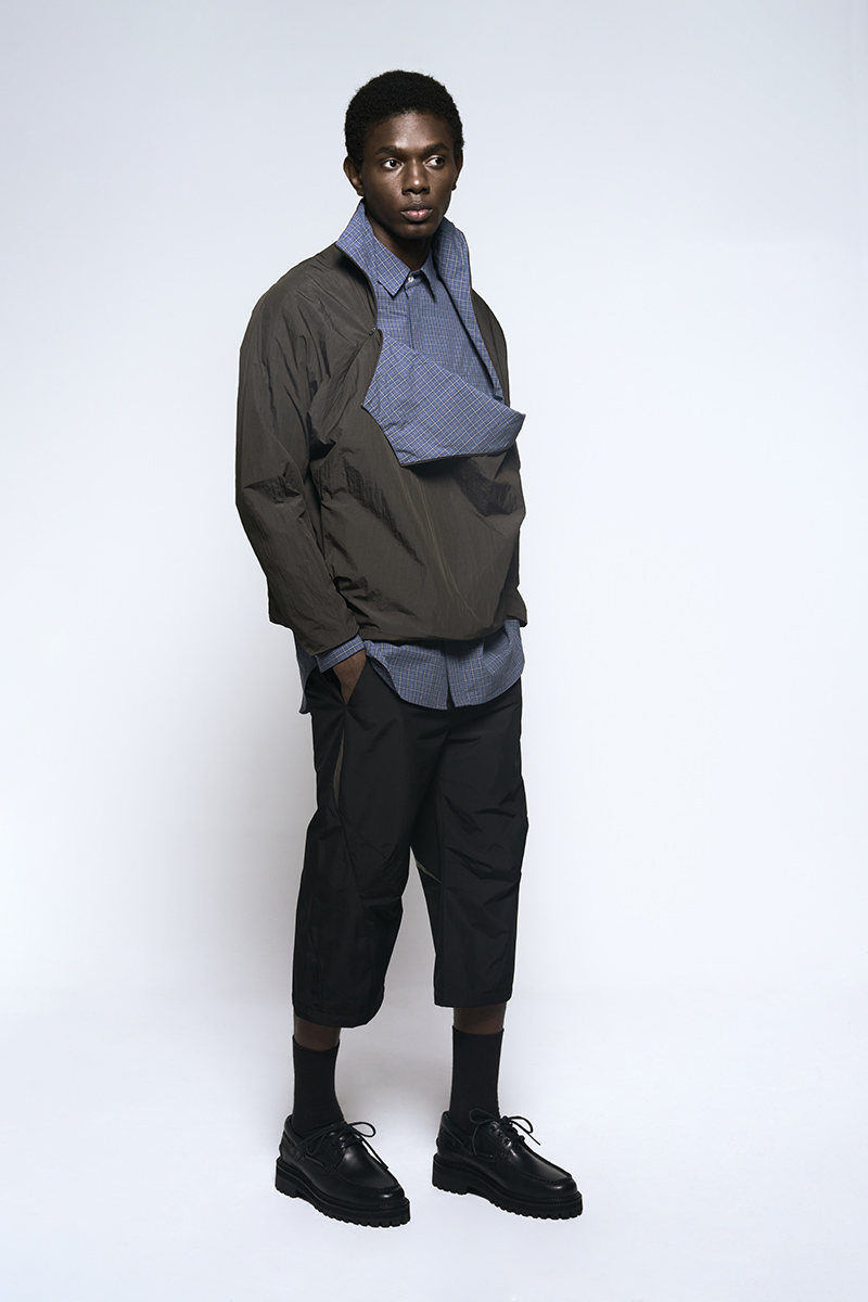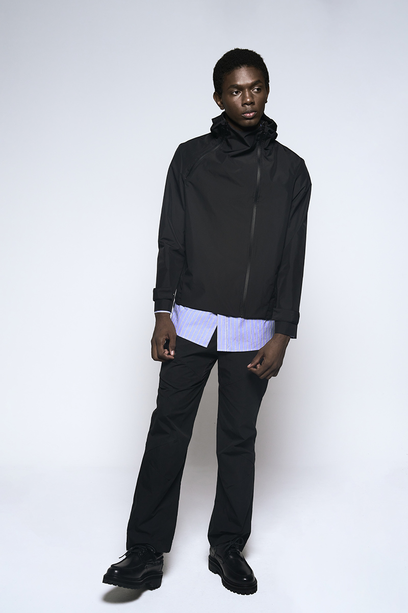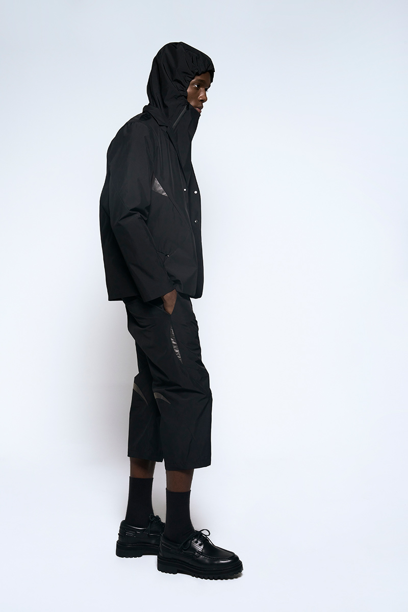 The clothing collection uses a sober, technical approach to biomimicry. It begins with an anatomical study of insects, particularly beetles. This research is translated into lines, volumes, and structures that suggest organic forms while maintaining a functional focus. The collection features technical fabrics from Italy and Japan, including temperature-regulating textiles, waterproof materials, and precisely manufactured virgin wools.