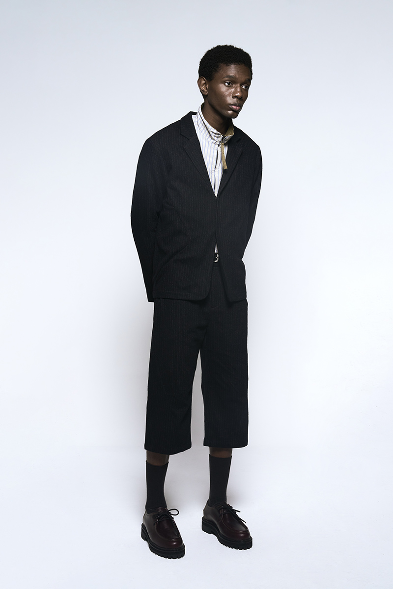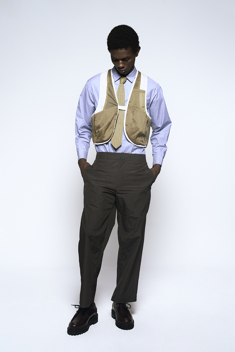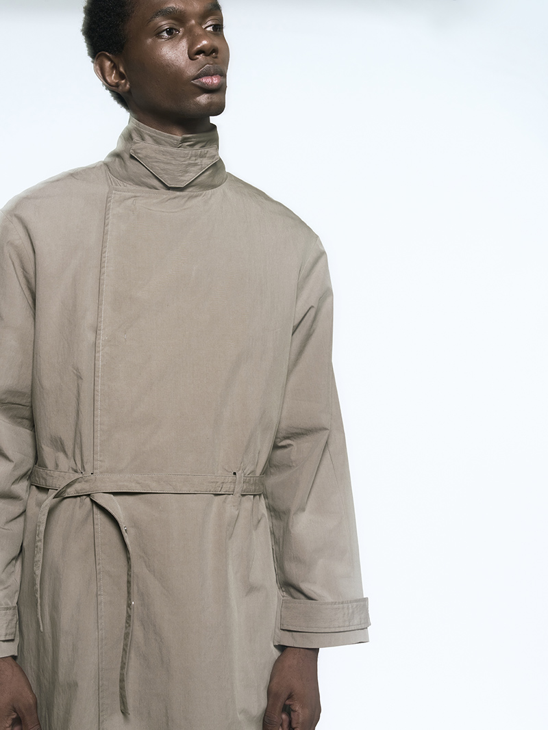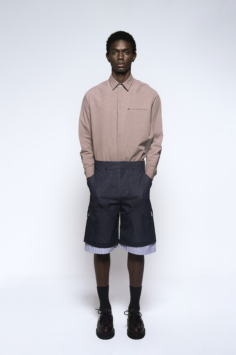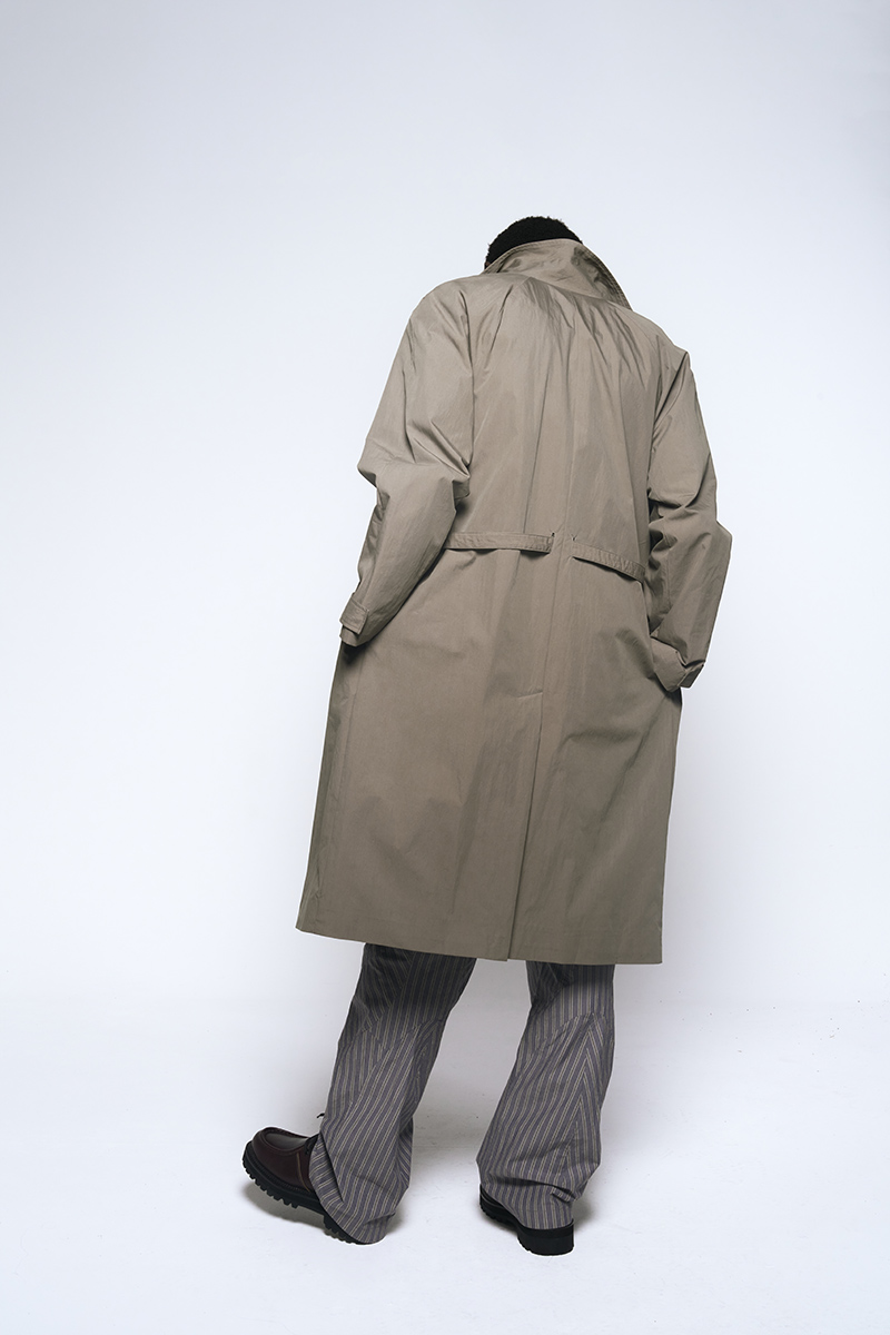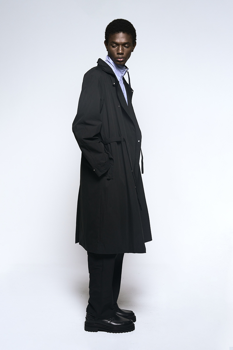 The clothing collection uses a sober, technical approach to biomimicry. It begins with an anatomical study of insects, particularly beetles. This research is translated into lines, volumes, and structures that suggest organic forms while maintaining a functional focus. The collection features technical fabrics from Italy and Japan, including temperature-regulating textiles, waterproof materials, and precisely manufactured virgin wools.
