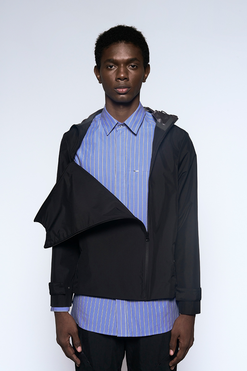 The clothing collection uses a sober, technical approach to biomimicry. It begins with an anatomical study of insects, particularly beetles. This research is translated into lines, volumes, and structures that suggest organic forms while maintaining a functional focus. The collection features technical fabrics from Italy and Japan, including temperature-regulating textiles, waterproof materials, and precisely manufactured virgin wools.