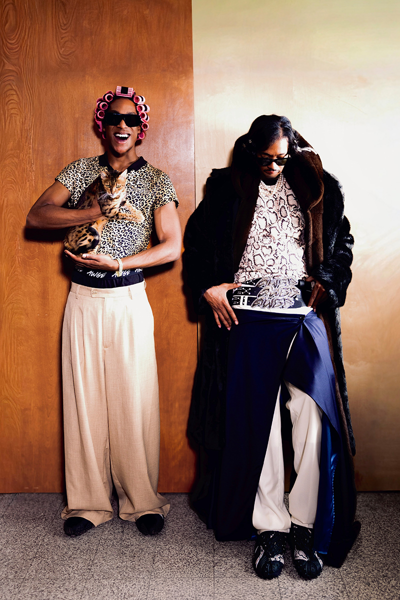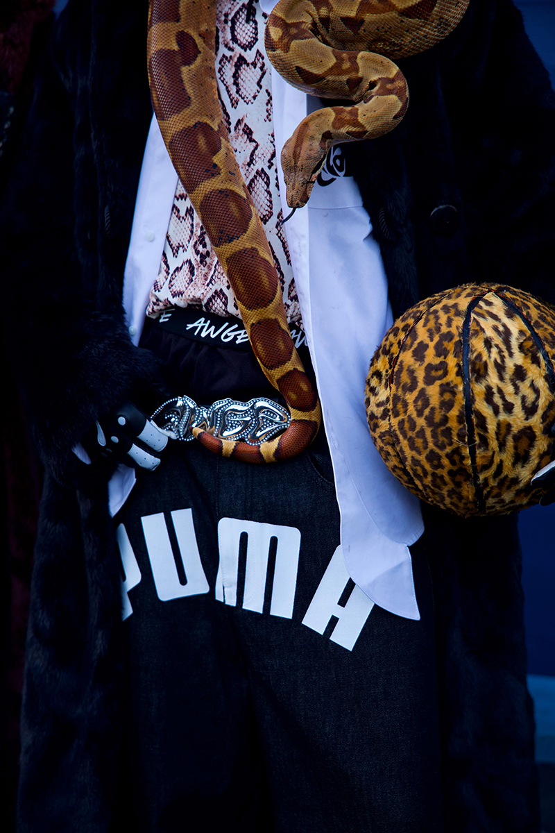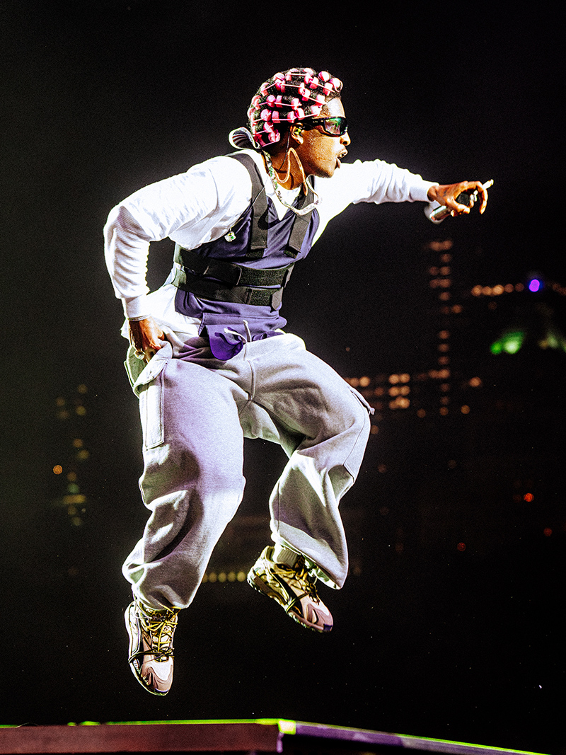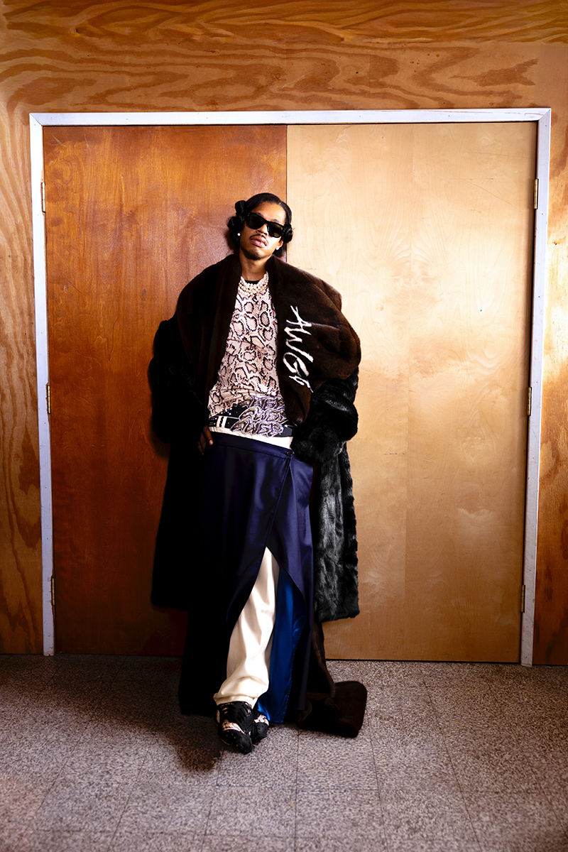 The result is a collision of cool textures. Snakeskin, leopard print, and shaggy faux-fur appear alongside statement denim and graphic tees. The look is a deliberate blend of past and present, filtered through Rocky’s distinct point of view.