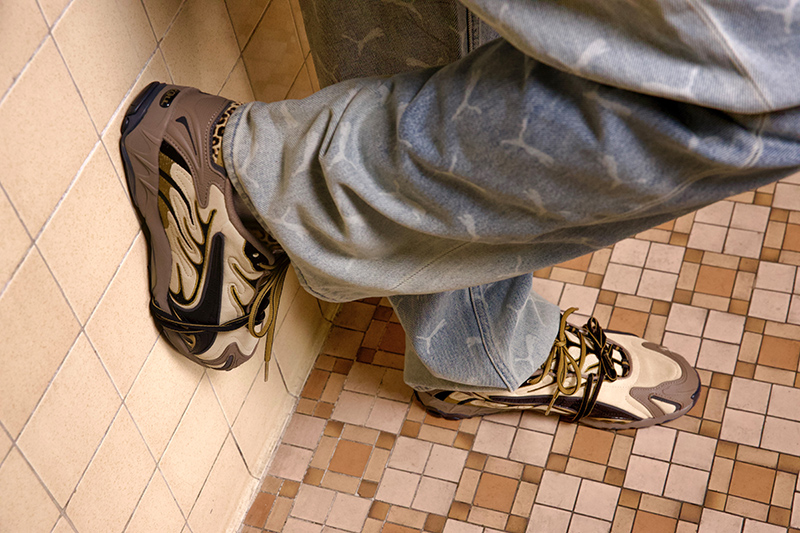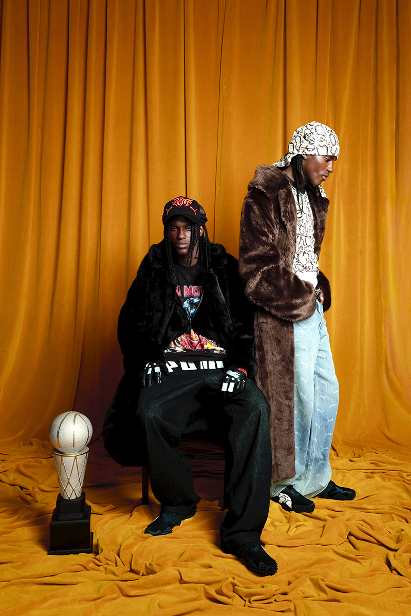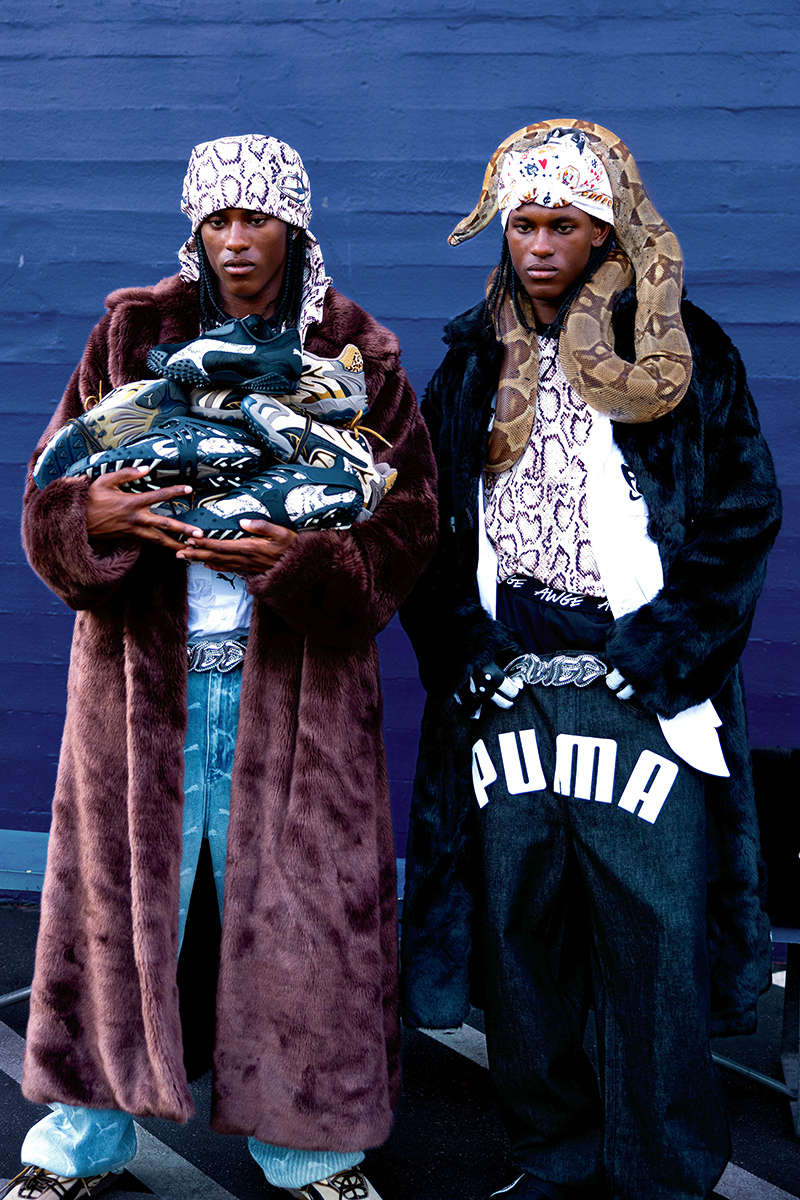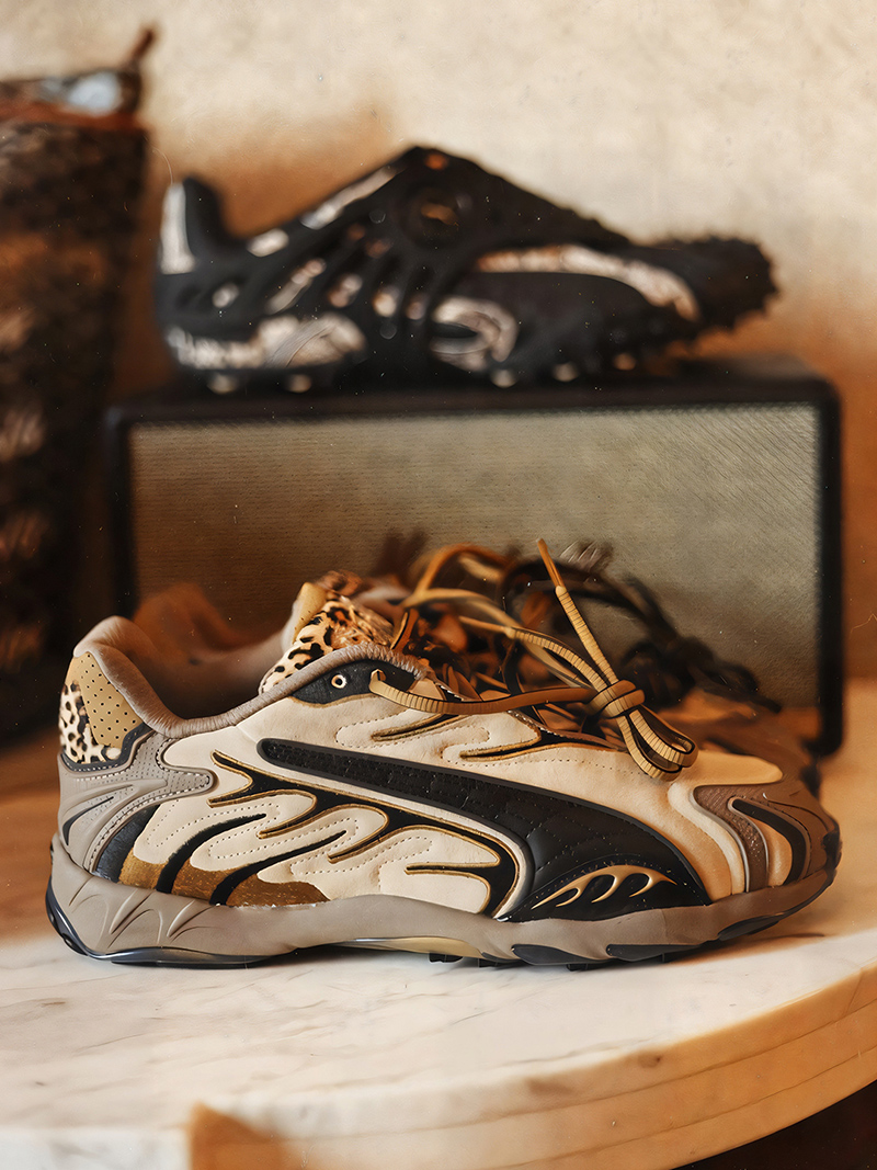 The footwear includes two of his favorite PUMA models, the Inhale and the Mostro OG, updated with animal prints. The standout is a new design called the Mostro Gabbia, Italian for “Caged Monster.” It features a removable cage and is described as a “creature of design.” Rocky noted that a snakeskin sample of this shoe set the creative tone for the entire collection, blending luxury materials with a sharp, technical build.