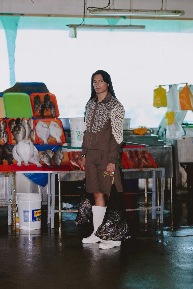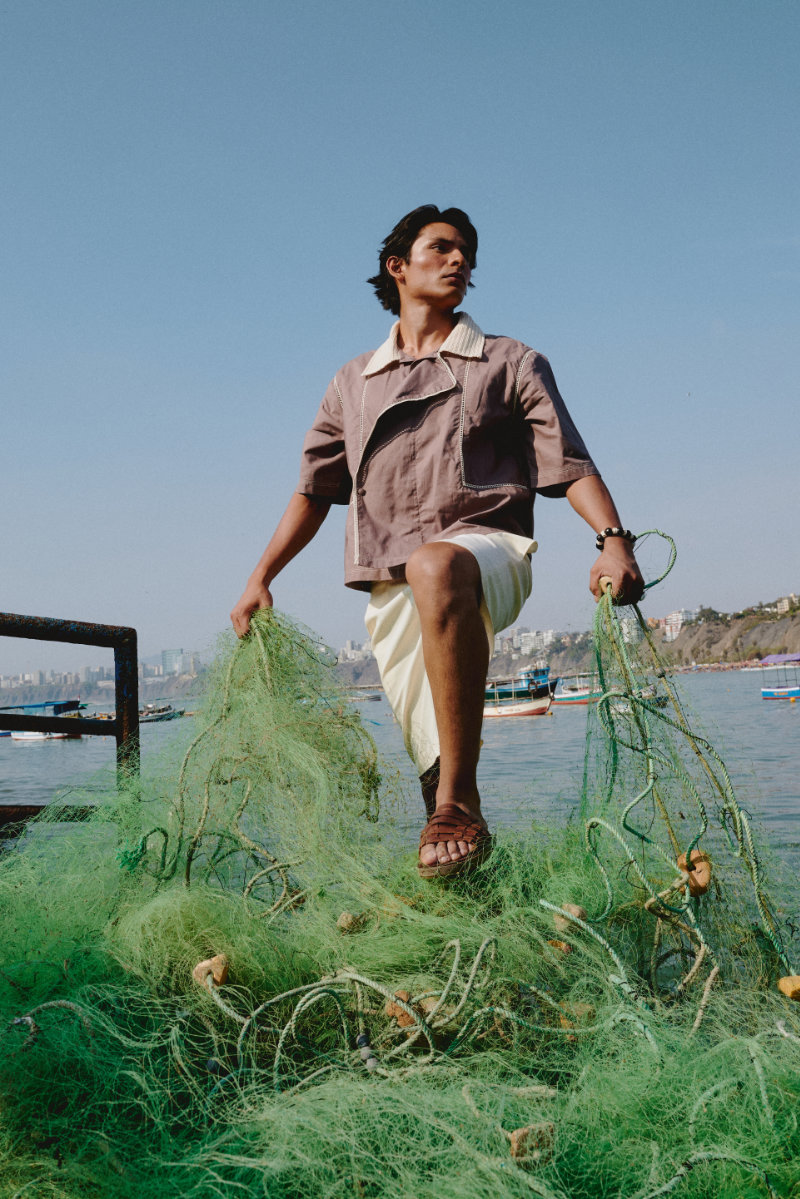 Material innovation is central. In collaboration with the accessories brand Biaróh, the collection uses fish leather made from corvina. This biomaterial is sourced from local fishing by products that are typically discarded. The line also incorporates recovered yarns donated by Tren Perú, reflecting a commitment to conscious production.