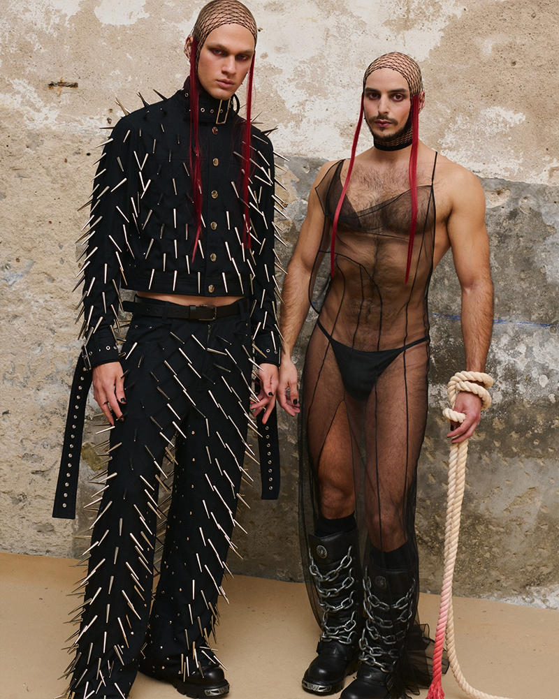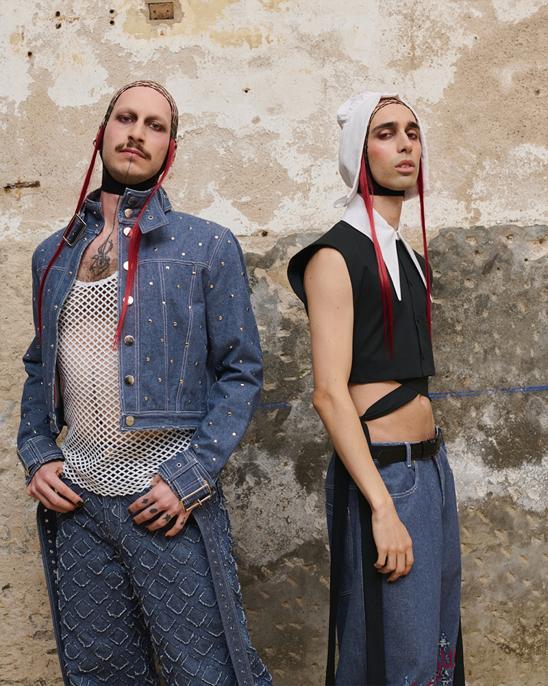 The clothing uses powerful symbols to make its point. The sambenito, the stake, and the scar are all reinterpreted through a modern view. The goal is to transform pain into pride, and shame into a banner of empowerment. Medieval details are placed next to the iconography of queer movements from the 1970s and 80s. This creates a hybrid language that mixes historical archive, protest, and desire.