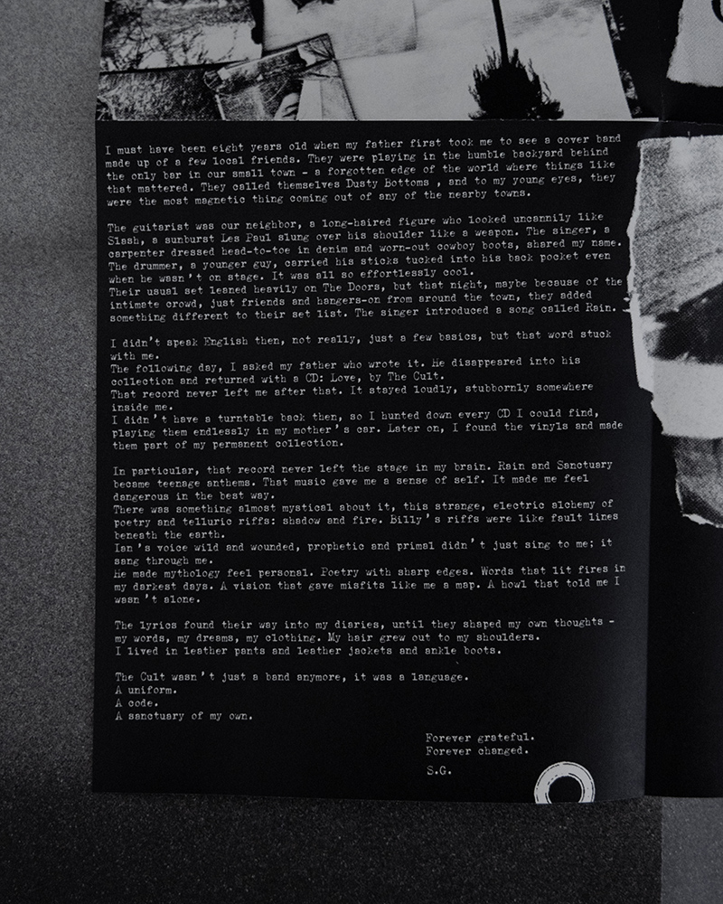 “In my teenage years, the Cult wasn’t just a band, it became a language, a code, a sanctuary,” Gallici noted. “Their music gave me a sense of self: dangerous, poetic, and free”.