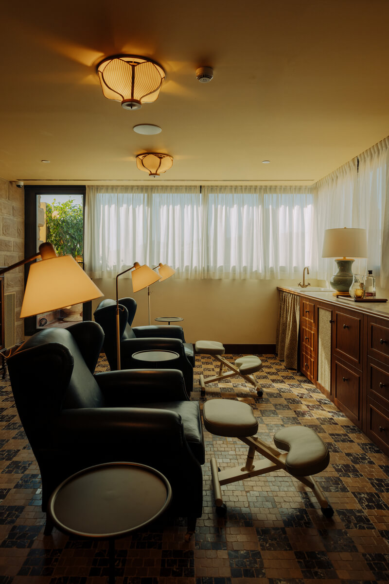 The upper floor is home to the Soho Health Club, the second of its kind in Barcelona. Its design merges performance and relaxation, offering treatments by SkinCeuticals, Cowshed, and Omorovicza, alongside advanced therapies such as LED sessions, HydraFacial body treatments, and PEMF mats. The gym below maintains the building’s original ceramic references while incorporating a contemporary workout layout. A fully vegetarian café, Soho House’s first, completes the experience, offering post-workout smoothies and plant-based snacks.