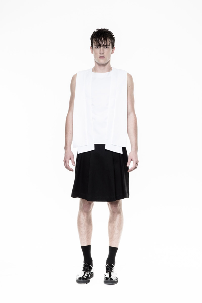 London Menswear designer Benjamin Bertram’s Spring/Summer 2014 collection is a futuristic vision inspired by the film adaptation of the novel Logan’s Run, released in 1976. A visit to Ciudad de las Artes y las Ciencias in Valencia, Spain, provided key visual references for design through architectural lines, a collection of awe inspiring buildings inspired by their purpose. The result is a collection formed around clean lines and structured silhouettes, with layers working together to create the overall look.