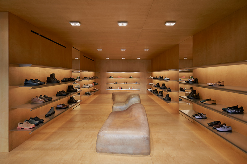 Inside, a feeling of calm takes over. The walls, floor, and ceiling are covered in birch wood, creating a soft, serene environment that plays with the natural light. The shoes are displayed on minimalist stainless steel frames. A single piece of fiberglass furniture acts as both a seat and a part of the display, blending art with use.