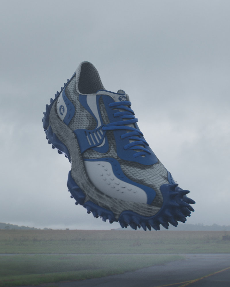 The design is defined by a rubber outsole with pointed lugs running from toe to heel. This pattern is meant to provide traction and grip. The midsole is structural and reptilian in inspiration, wrapping the upper in a single piece of injected KPU for durability. Recycled mesh allows for ventilation. Underneath, a high resistance EVA base offers cushioning and mobility. The ORTHOLITE® X40 insole adds comfort and energy return.
