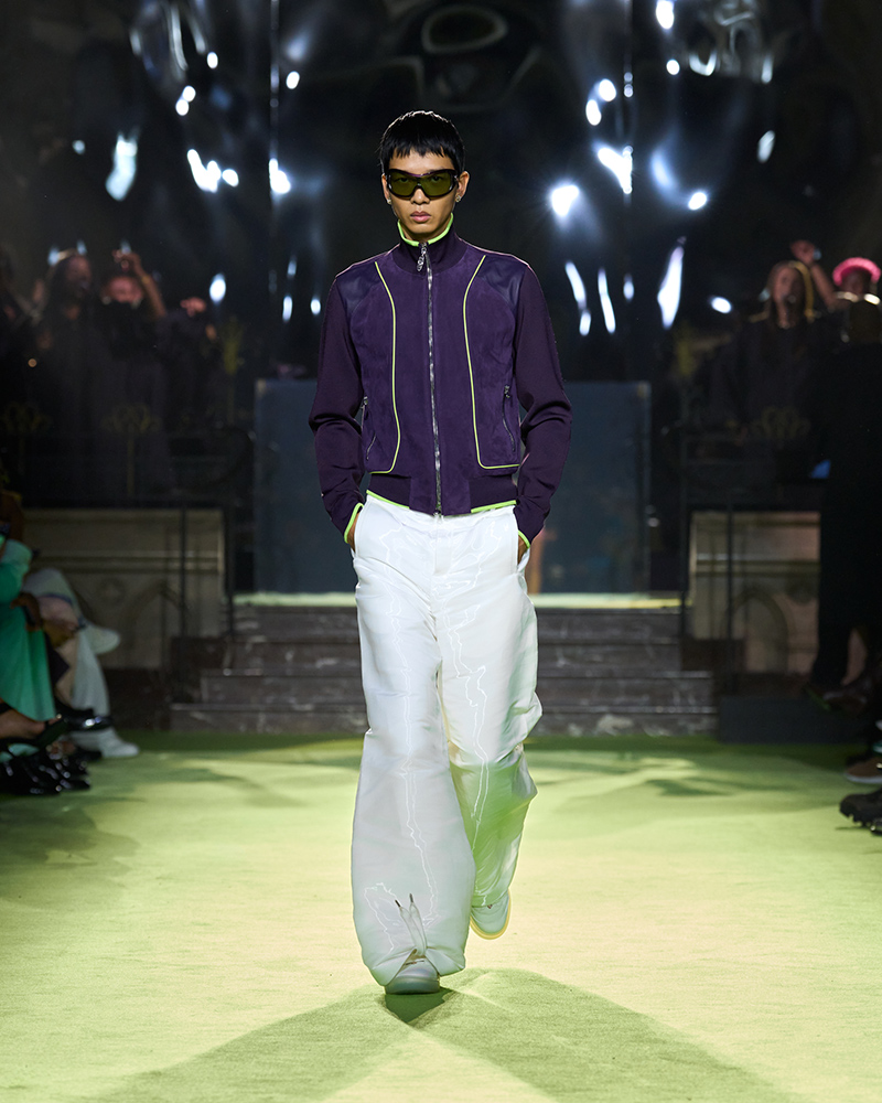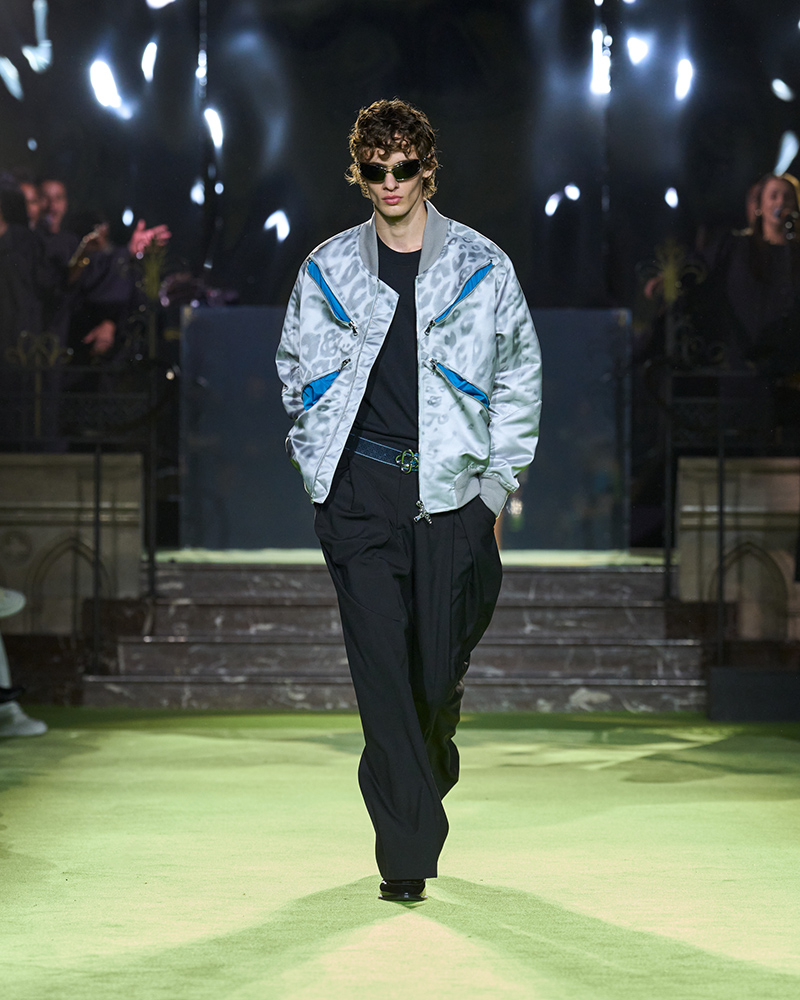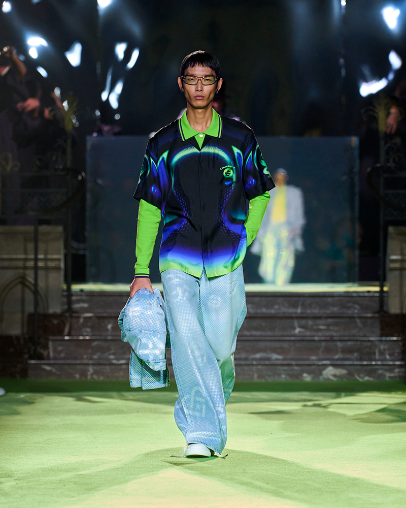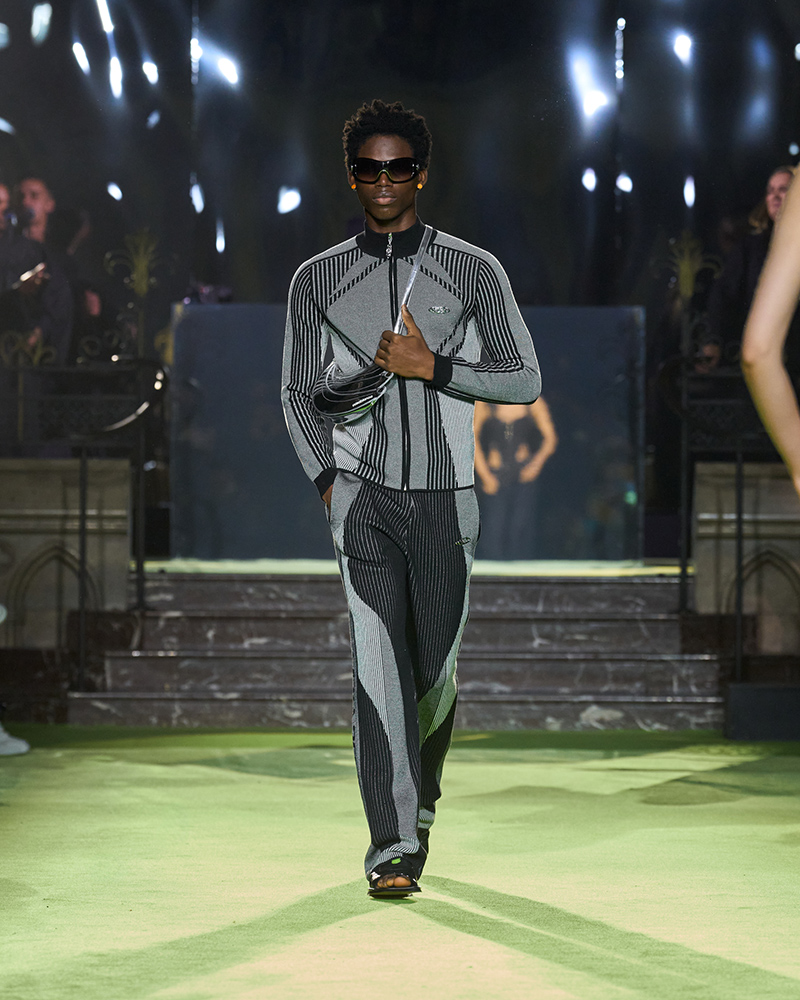 We see the dancer, in clothes made for movement where easy fits contrast with body-conscious shapes. The brand’s signature gradient patterns are re-engineered to look like sound waves. We see the DJ, dressed in patterns inspired by rave flyers and smiley-face logos, rendered in intricate jacquards. We see the “Nightclub Proprietor” in oversized, nonchalant tailoring. Even classic Casablanca prints, like the orchid, are glitched as if seen on an old screen.