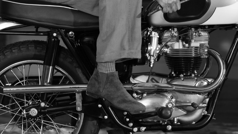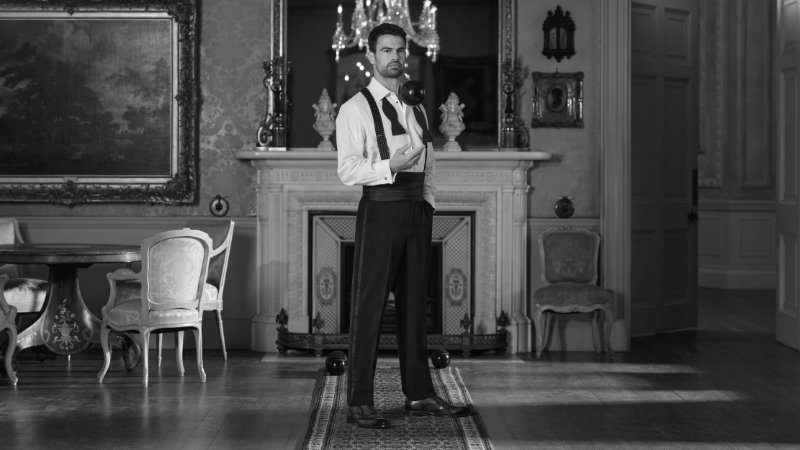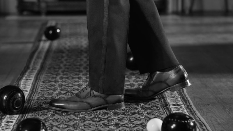 A quick change into another version of the Rother loafers, this time in lightweight ecru linen with brown leather details, sets the stage for a session of twitching, peering through binoculars at the estate’s avian inhabitants, before a rendezvous with a cherished bird of prey perched regally on his arm. From wings to wheels, Theo James decides to tinker with the gleaming mechanics of a classic motorbike in the ballroom wearing suede Reigate ankle boots. By nightfall, we find him in black tie, Hampstead oxfords, and a mood for mischief: furnishings have been artfully rearranged to allow room for an impromptu game of lawn bowls atop an antique runner.