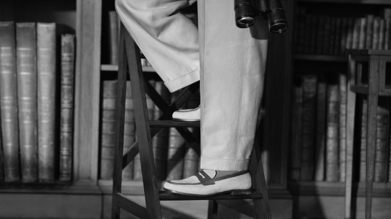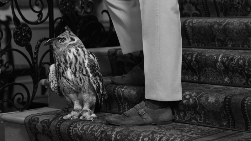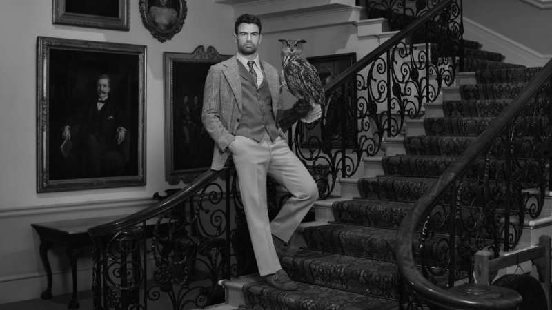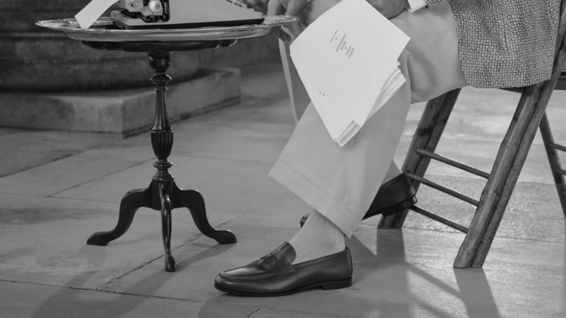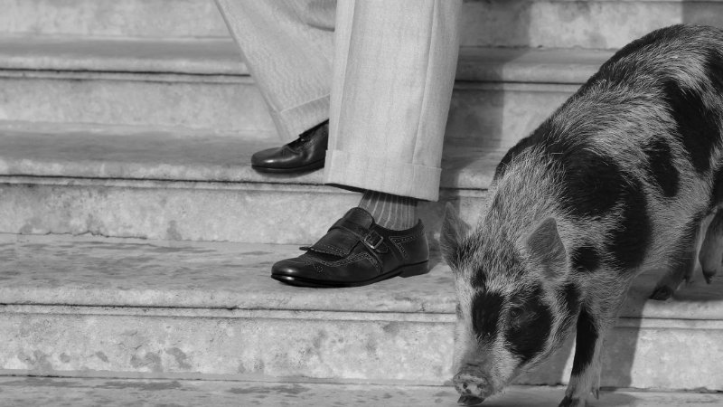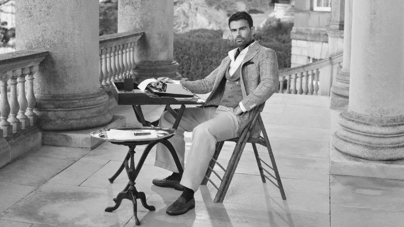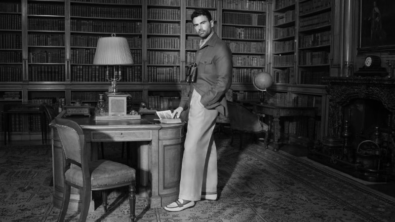 Building on the spirit of the Fall/Winter 2025 campaign, the audience finds Theo James in a sequence of moments across the manor. The day dawns on the majestic portico, where the British actor perches at a café table, tapping away on a typewriter to chronicle his “Almanac of English Eccentricities,” his feet clad in supple Rother loafers that complement his tailored ensemble. With creativity sated, he descends a sweeping staircase to escort a pair of pot-bellied piglets on their leisurely morning amble, stepping assuredly in a pair of polished Shanghai monk straps.