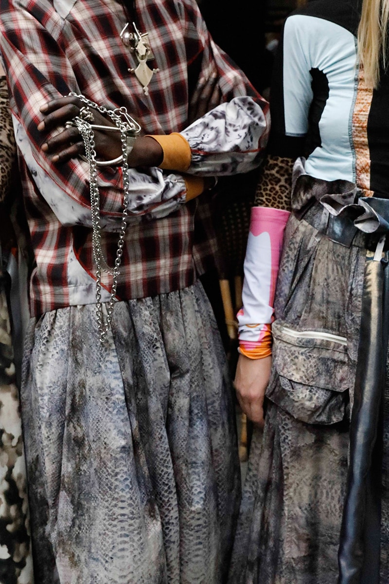 Titled “Kebaby“, this collection is an amalgam of numerous inspirations, usually deriving from the most mundane details of daily life that go unnoticed. What lies at the core is the aesthetics of a defunct Turkish kebab shop once encountered in Pigalle. The collection narrates states of in-betweenness, being constantly in transit and experiencing non-places. Rave culture merges with monastic elements. Featherweight nylon dusters, floor-sweeping trousers and caftans, and athletic performance-inspired gear come together in the form of couture sports. Liquid high-tech jerseys, ultra-lightweight running fabrics, and heavy denim shape a post-gender, post-ethnic language. Animated with subdued theatricality, the clothes play with weight and movement in a way that has a direct impact on self-perception and wearer’s attitude.