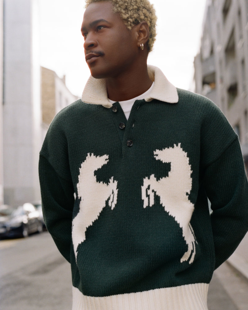 The collection celebrates the Year of the Fire Horse. It includes sweaters, cardigans, hoodies, t-shirts, and shirts. The pieces feature intarsia-knit horse motifs and embroidered logos.