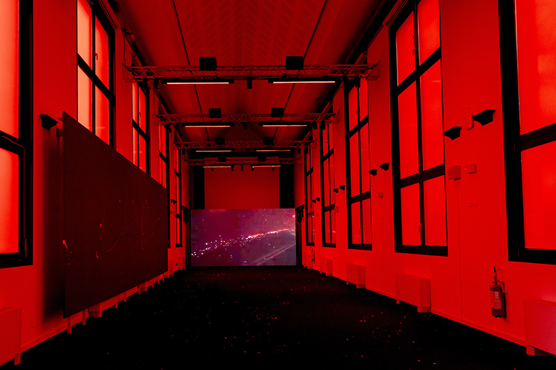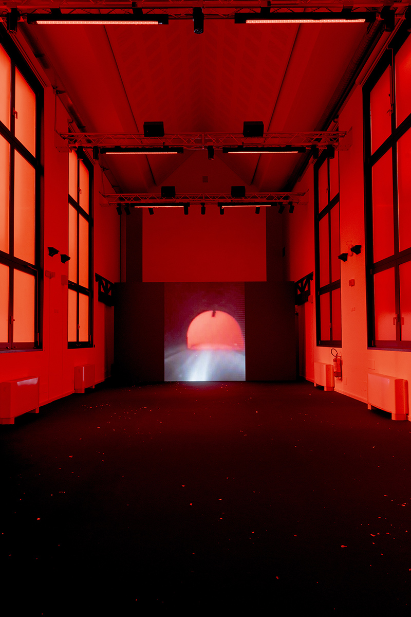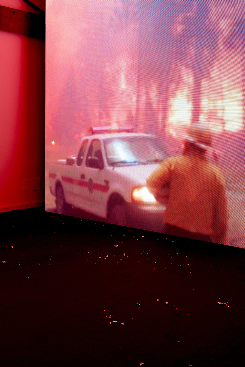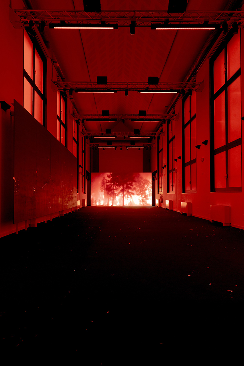 Inside the exhibition, a monumental LED wall displays footage of forest fires, alongside six large-scale paintings created with traditional Milanese gilders. A black carpet scattered with silver dust and perfumed with firewood incense completes the scene, all bathed in a deep red glow that transforms the gallery into a liminal, dreamlike landscape.