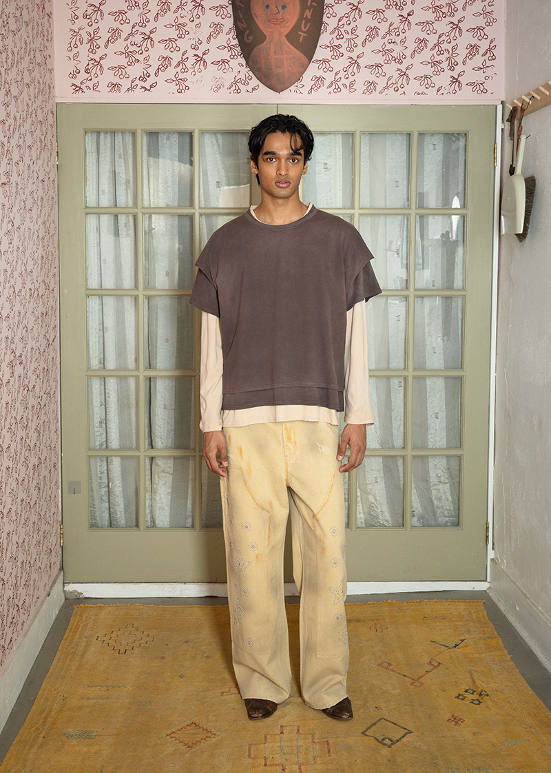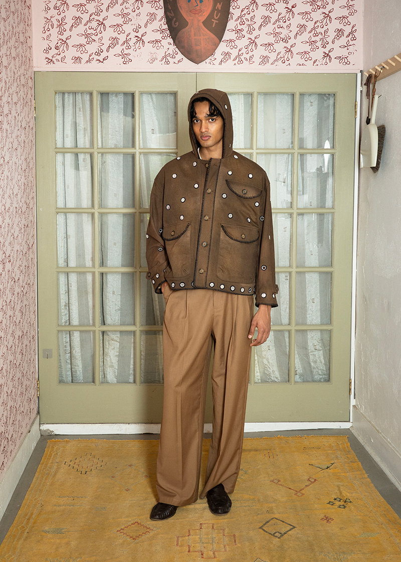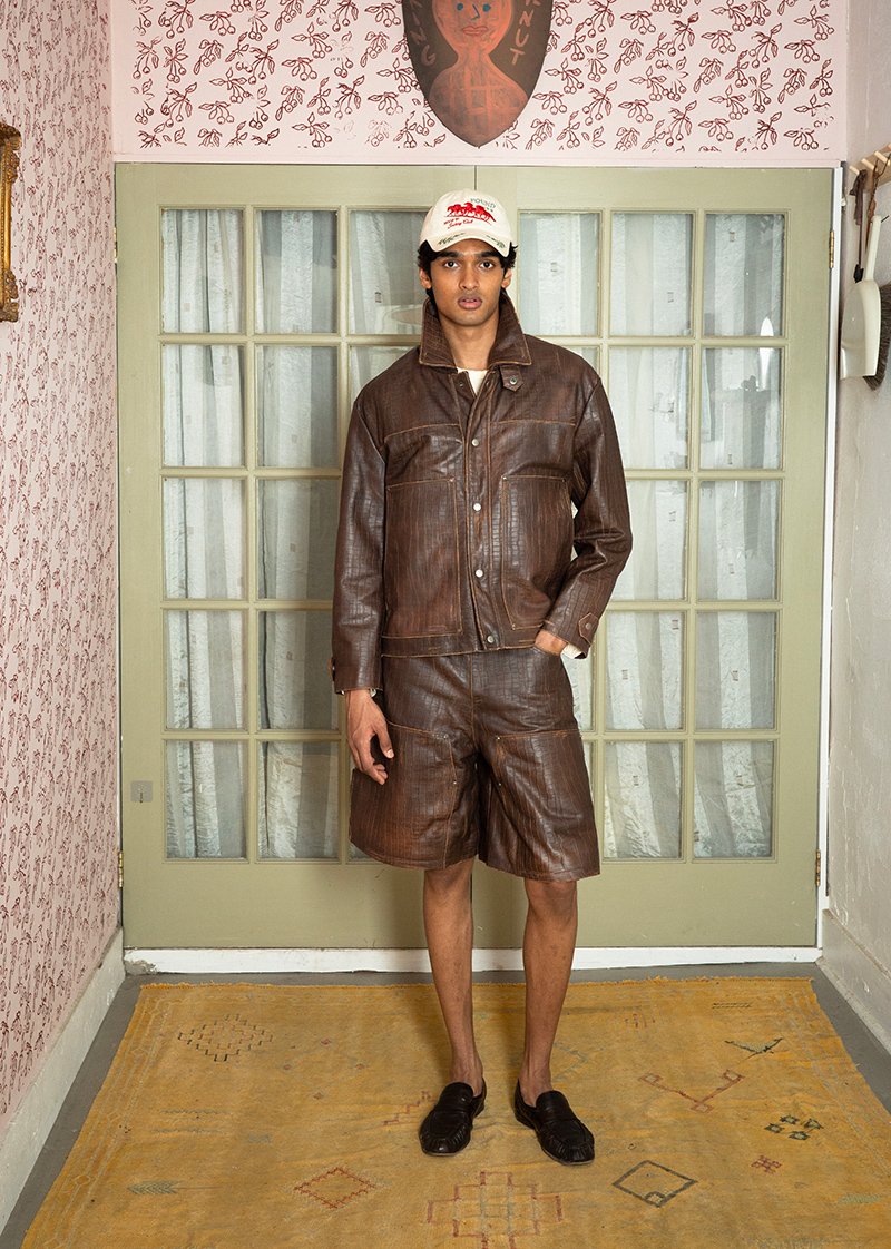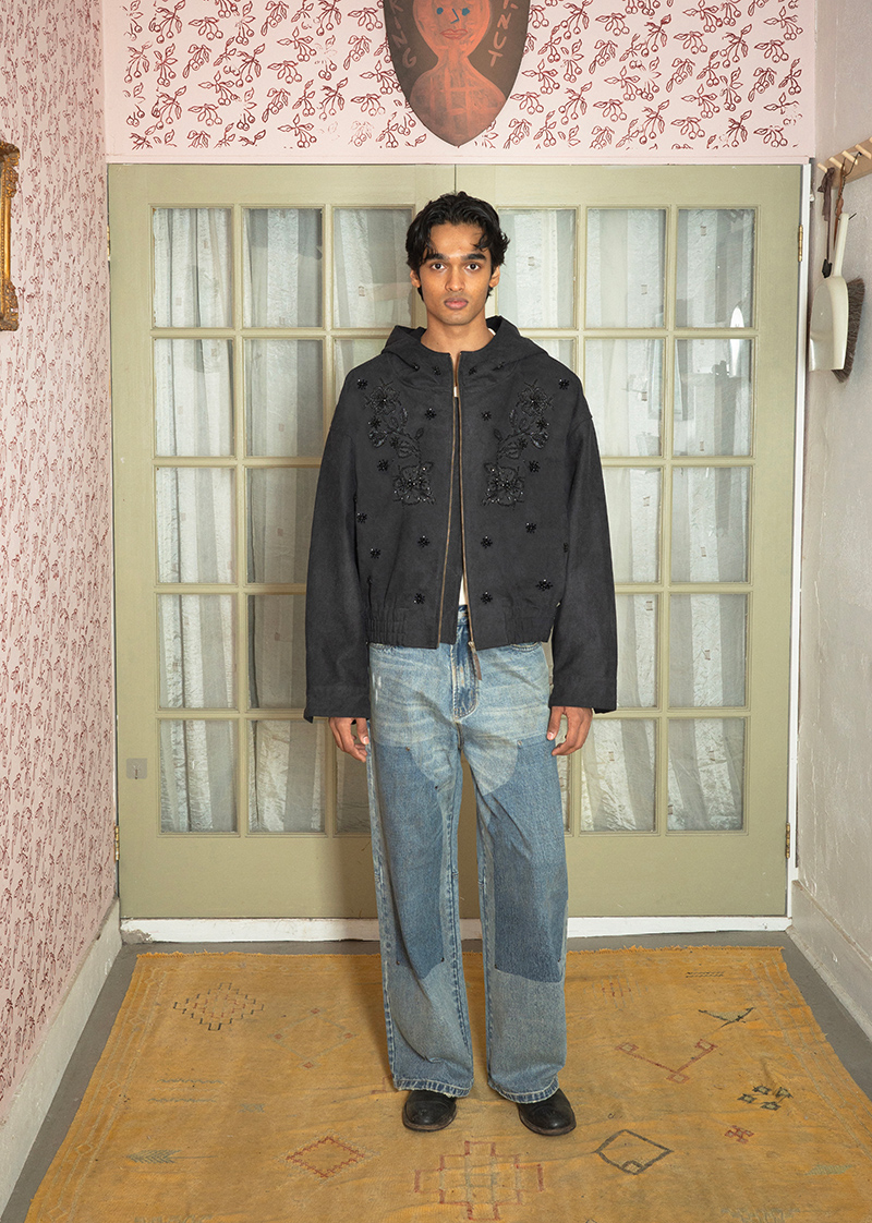 This duality reflects a first-generation identity, finding harmony in what seems like friction. Enzyme-washed fabrics are made to look timeworn, then adorned with light-catching metallic details. The clothes feel both in decay and in development, mirroring the constant change of the immigrant experience.