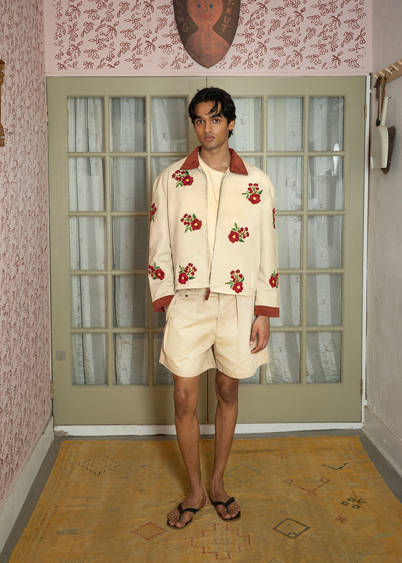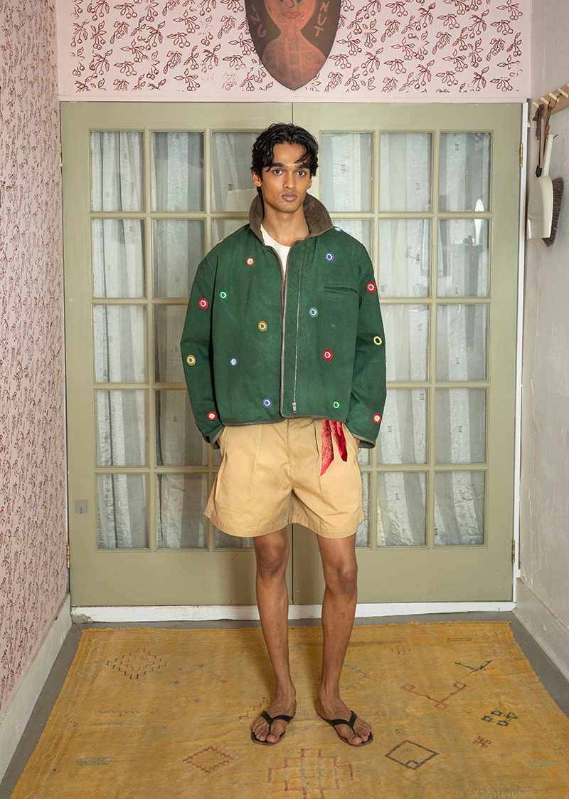 The core of the collection is its artisanal outerwear. Familiar workwear shapes are transformed. Skilled artisans in Pakistan cover them with intricate embroidery, sequins, and mirror work. These pieces act as cultural records, placing the eccentricity of South Asian occasion wear against the sturdy twill of American work clothes. This creates a recurring tension between delicacy and grit.