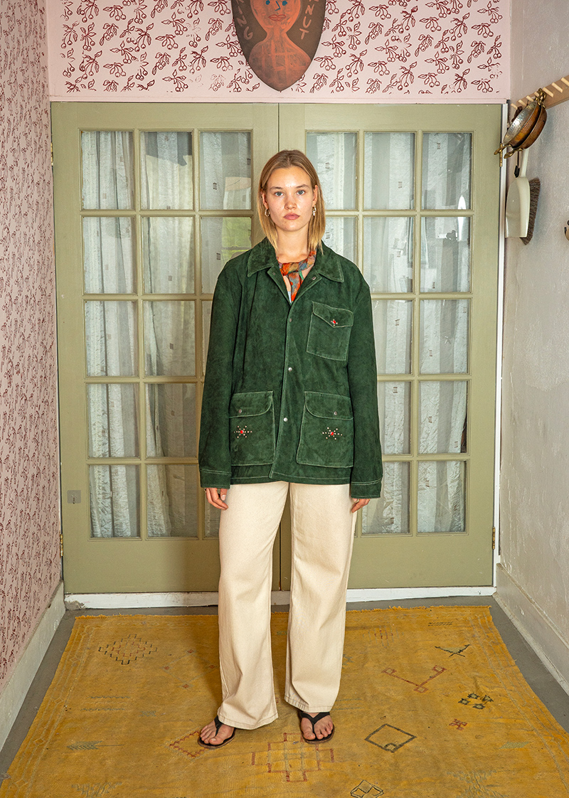 The collection also expands into sportswear. Nylon track jackets and embroidered cotton jerseys draw from international football culture, but maintain FOUND’s lived-in aesthetic. Bottoms like tapestry carpenter pants and paint-treated corduroys are often paired with matching tops to create complete looks.