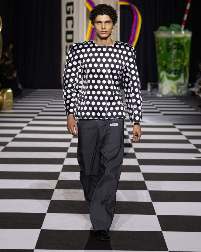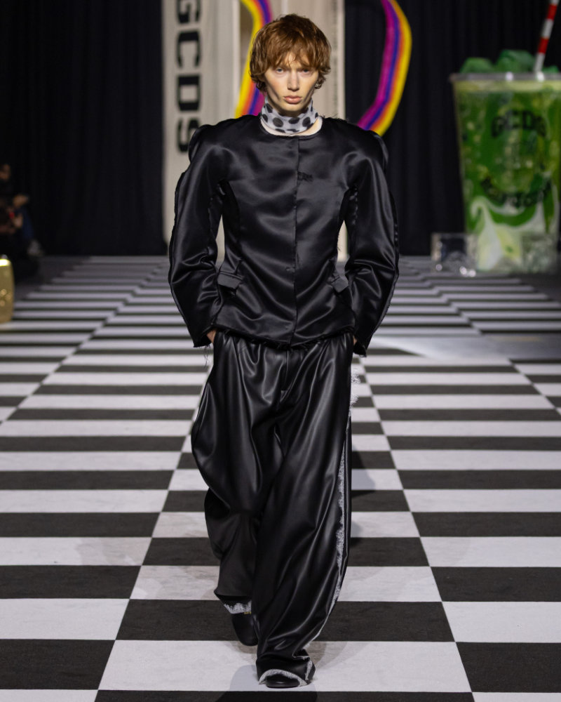 Creative director Giuliano Calza describes the collection as emotional baggage. Not what you carry, but what you have collected over ten years. The show moved through the brand’s history without being a straight retrospective. Early looks referenced GCDS’s beginnings. College-inspired silhouettes in acid pastels. Varsity jackets and track jackets paired with denim. A collaboration with Valentino Rossi appears, the motorcycle racer and Italian style icon. Animal prints show up across exaggerated shapes. Python and leopard in bright colors. Tailored pieces are oversized. Garments are intentionally imperfect. Seams slightly off. Cuts a bit wrong. Details left unfinished. A rotten apple motif appears throughout, a symbol for the GCDS guy: decadent and slightly dangerous.
