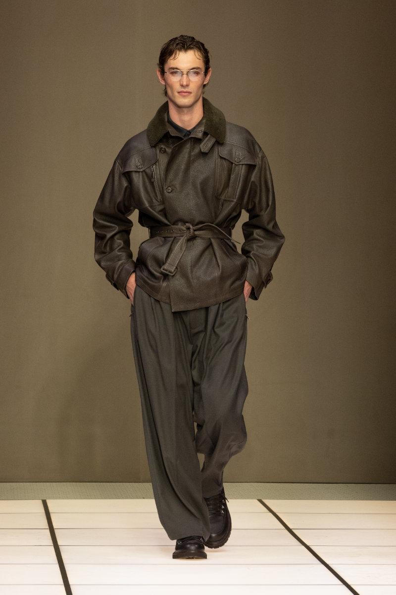 The silhouettes are fluid and relaxed. There are bomber jackets, low-button coats, wrap coats, collarless shirts, and wide-legged trousers, paired with suede shoes and boots. The clothes are made to move with the body, not restrict it.