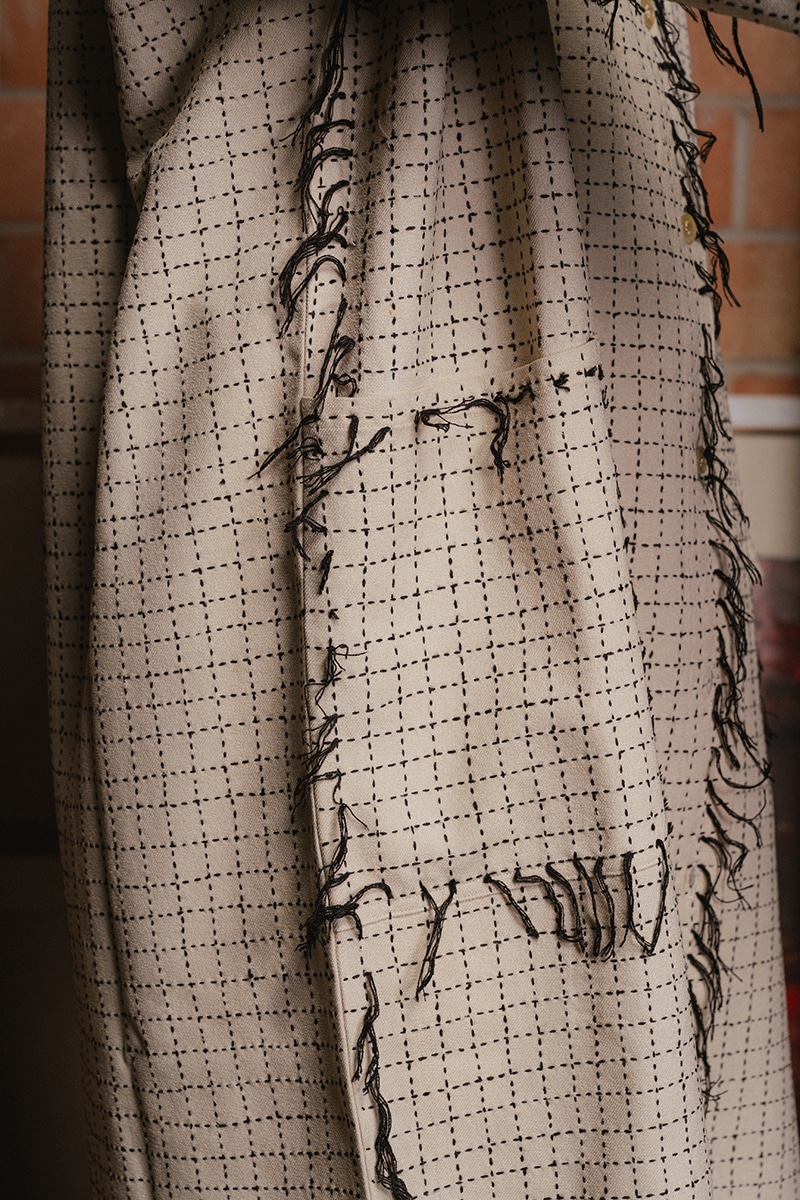 Creative director Saber draws inspiration from the art of Gustav Klimt and Egon Schiele. Their works are reimagined in hand-sketched motifs that run through the collection, creating a tension between control and freedom. The clothes mix structured shapes with flowing, expressive details, showing a push-and-pull between tradition and unrestrained emotion. It’s a clash of restraint and release, where the past is challenged by the intensity of feeling.