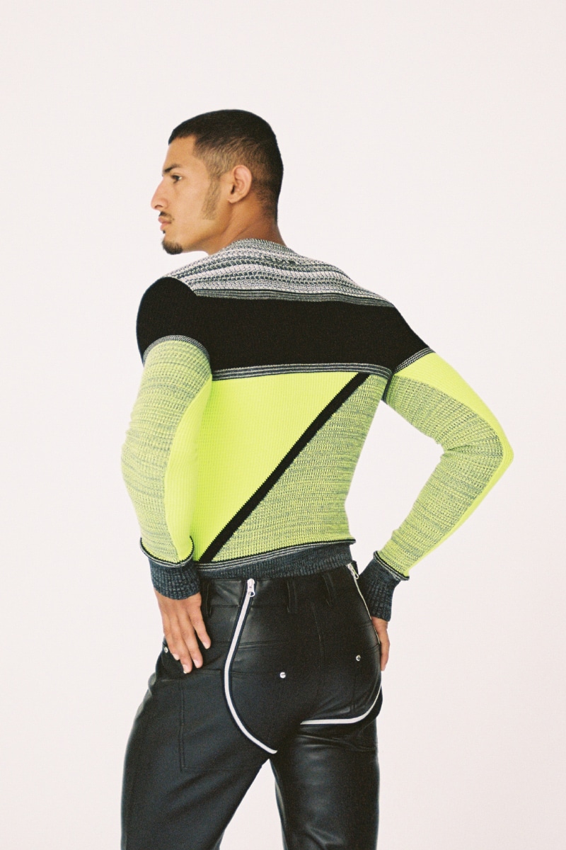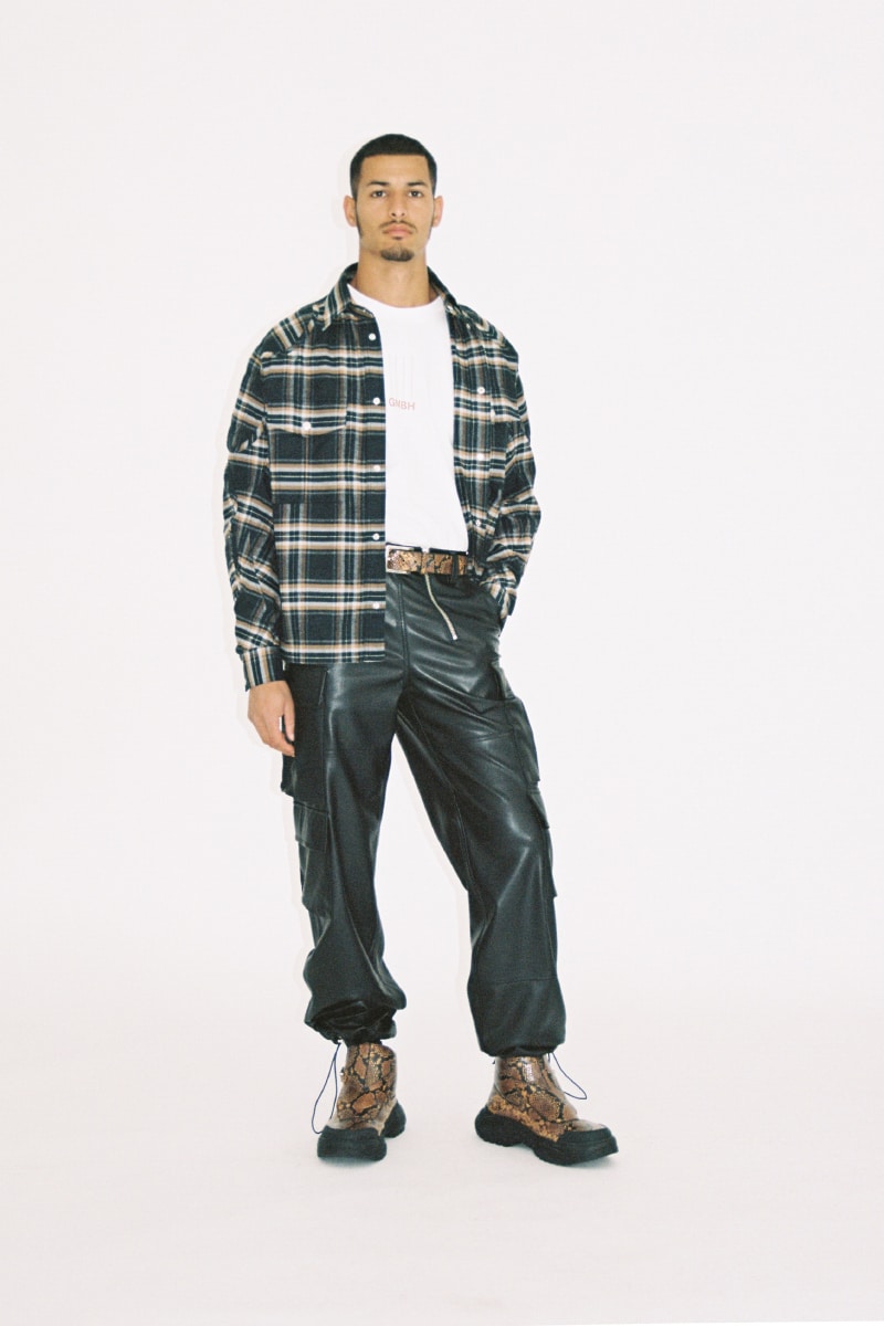 Continuing themes from the Fall 2021 ‘Welt am Draht’ show, this is a collection of key GmbH items, focusing on the essentials needed while going from work to club, from day to night. Winter 2021 uses well-established GmbH codes from workwear and clubwear, rendered here in pleather, Lycra and exposed hardwear. Their staple fleece jackets are redone in wool and faux python, as well as bringing back a GmbH classic, the embroidered Turkish wrestling trousers, now made in denim.