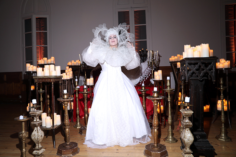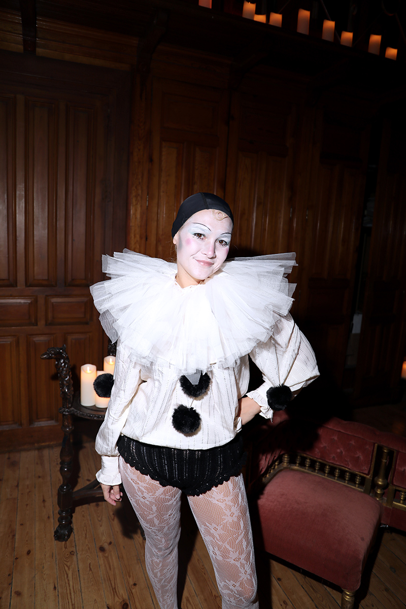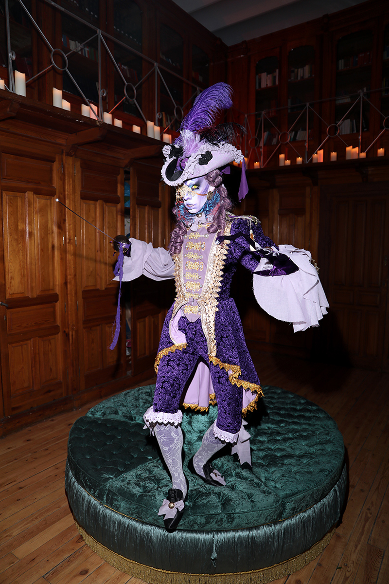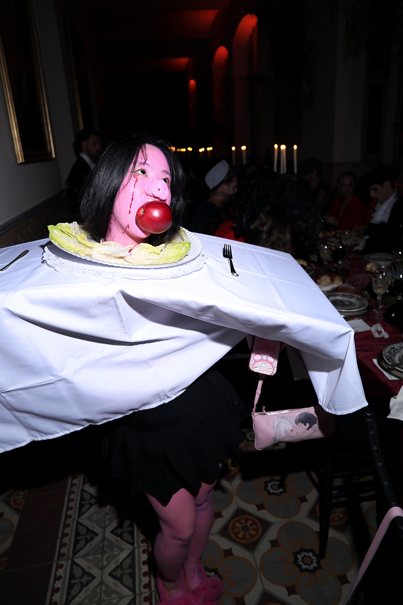 From there, people moved to the main hallway. This was the heart of the evening: a long, lavish table set for a vampire’s banquet. The menu, created by Ángela Gimeno, offered a dark version of classic dishes. There were oysters and breads with faces, a bloody salad, and a final blood-red velvet cake.