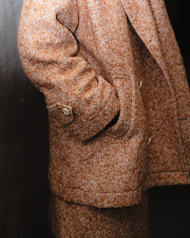The concept grew from nature into a wider reflection on carrying weight together, whether emotional, physical, or collective. The colors reflect this, blending pond greens and soil browns with sudden flashes of orange. Fabrics illustrate the theme directly, with etched toad-skin textures, patterns inspired by fungal networks, and playful graphics of stacked frogs. The clothing shifts perspective to an intimate scale. Tailoring references frog faces and webbed feet, while rounded, layered silhouettes suggest support and transformation.