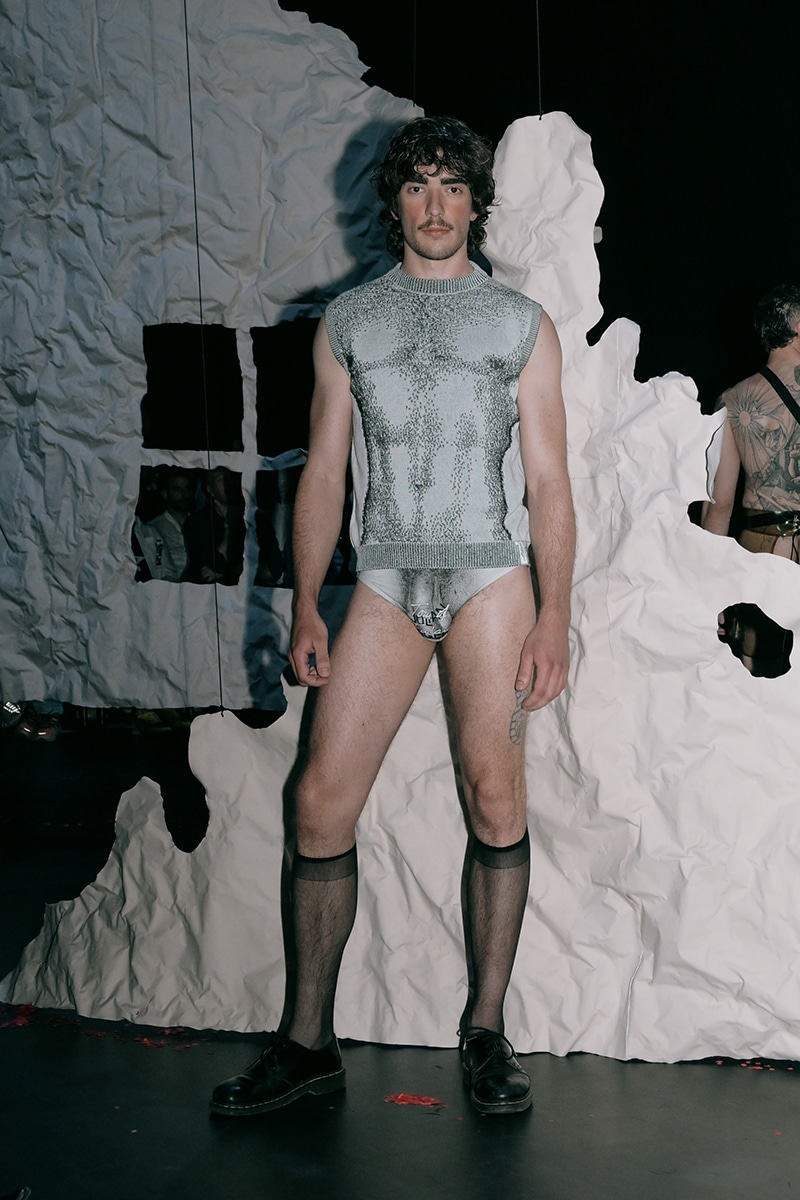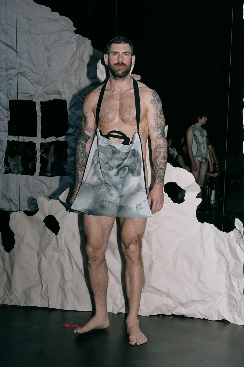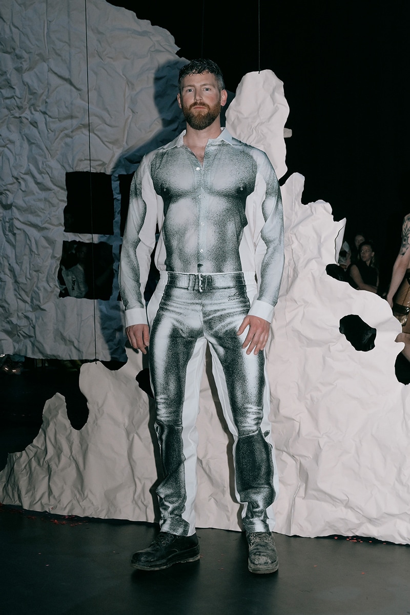 Two collections were presented. The first, The Limit Does Not Exist, was a collaboration with Berlin artist Andi Fischer. The second, Tom All Over My Body, worked with the Tom of Finland Foundation, and it wasn’t just a runway. Models cruised through the park like a slow, sexy parade. Someone in the crowd called it “horny and emotional,” and that felt right.