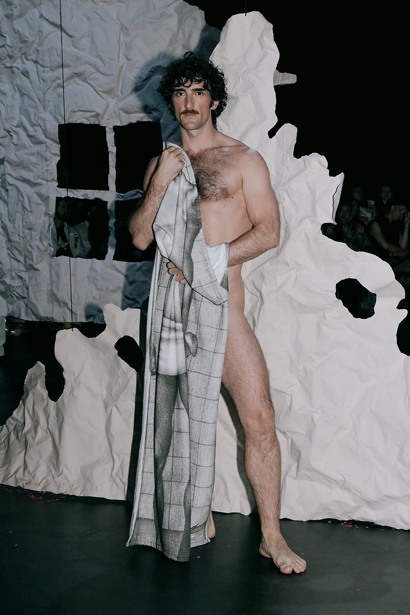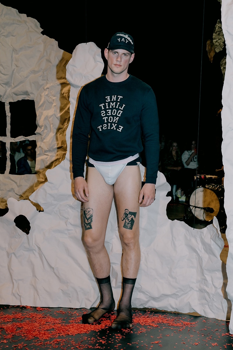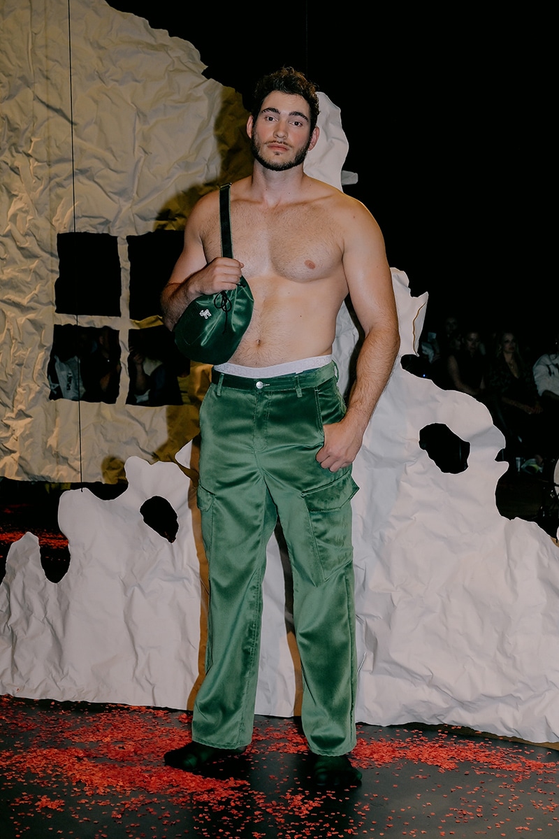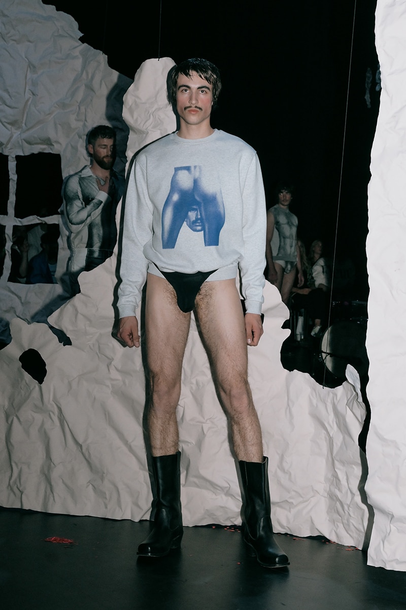 Two collections were presented. The first, The Limit Does Not Exist, was a collaboration with Berlin artist Andi Fischer. The second, Tom All Over My Body, worked with the Tom of Finland Foundation, and it wasn’t just a runway. Models cruised through the park like a slow, sexy parade. Someone in the crowd called it “horny and emotional,” and that felt right.