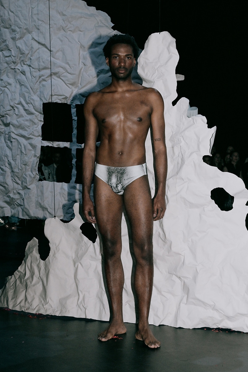 And then there were the underwear boys. Seven of them, nearly naked, in black and white briefs, thongs, jockstraps—all with Zigerli’s new pink elephant elastic waistband. A sneak peek of the Underwearli line, coming later this year.