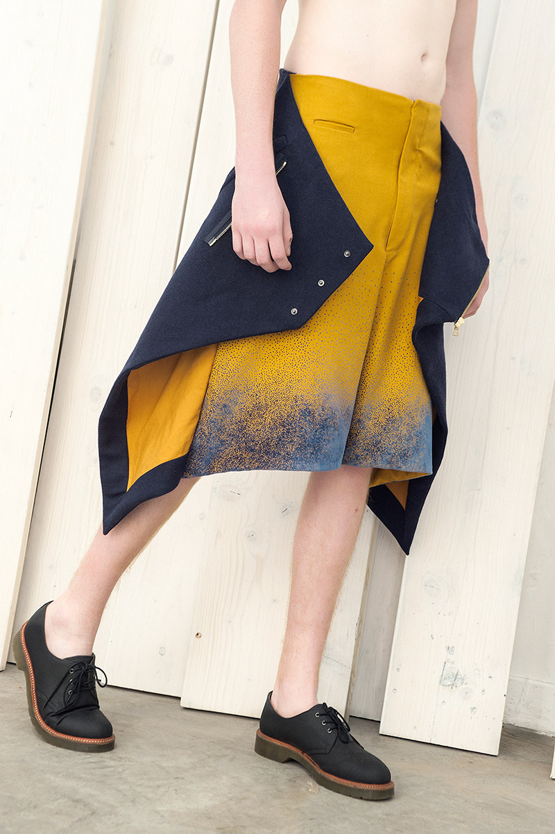 HIE is a project collaboration between London College of Fashion Menswear and Textiles students. HIE designers use layers, gradient and texture as the main tools to achieve astonishing effects into modern tailoring, knitwear and print. The main inspiration for the collection was a British identity seen through works of Chris Ofili and Sebastian Horsley.