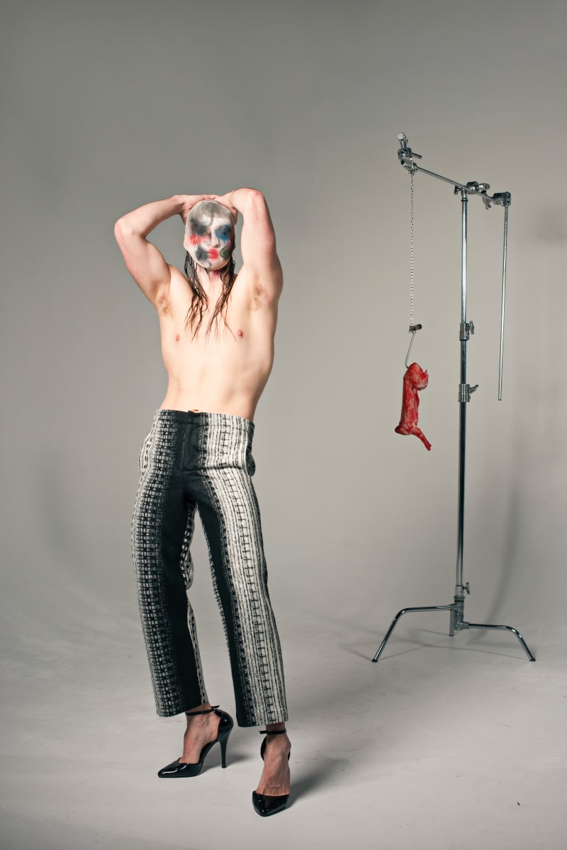Act 3 is the final performance where Levi himself turns into the performer and reveals himself to the camera. Within the bleak set, there is a hanging piece of meat brutally pierced with a hook. He is aware of the viewer, enticing them with his body and provocation like another dangling piece of meat to be consumed.