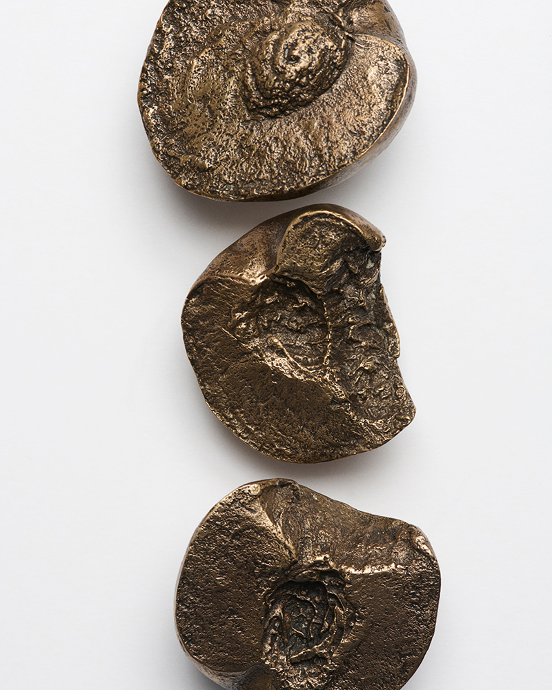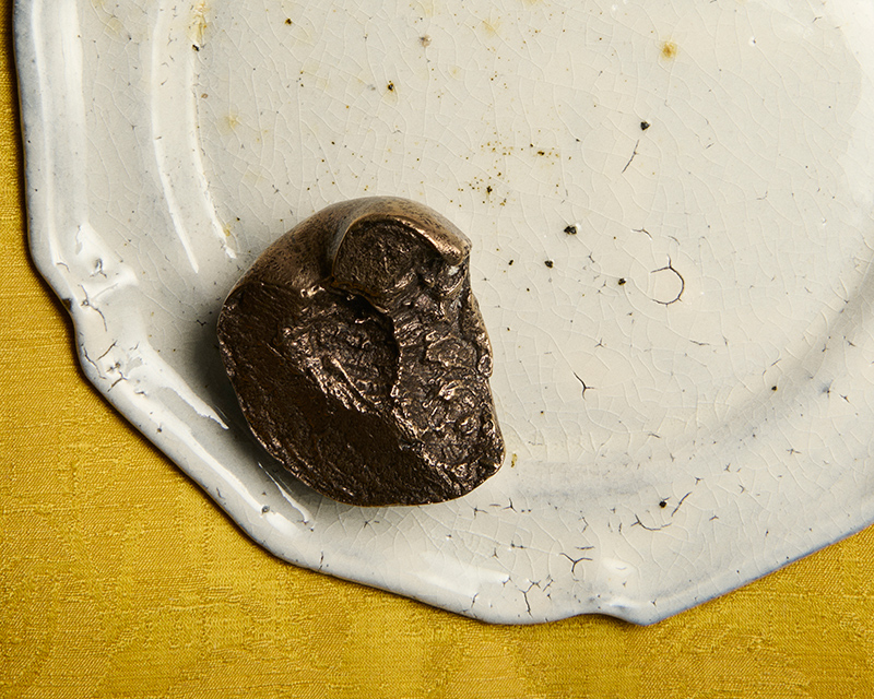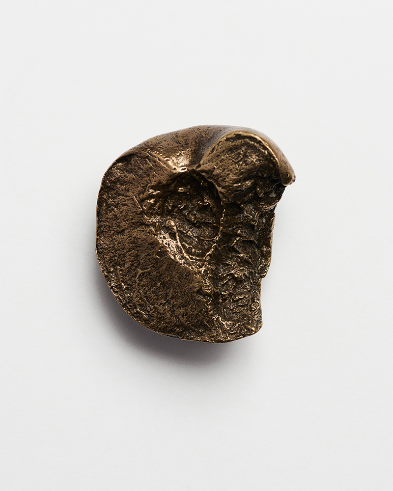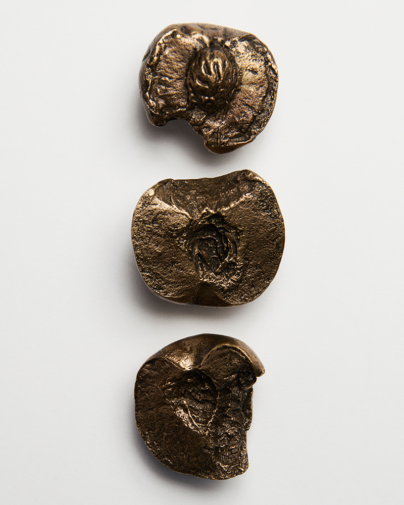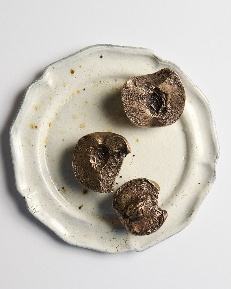 The process after the casting is done by hand. Any texture lost from the peach’s skin is carefully carved back in with a chisel. The surface is then sanded and buffed until it shines. The result is a solid, heavy bronze version of a soft, perishable fruit.