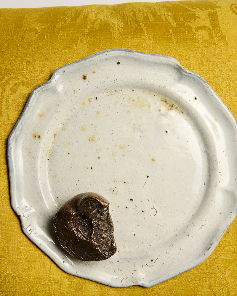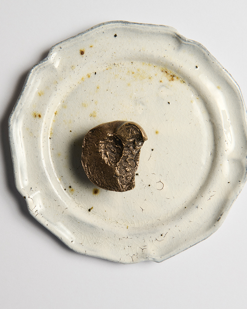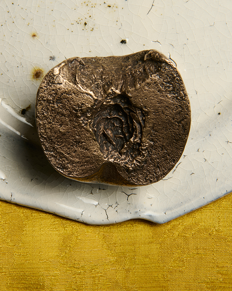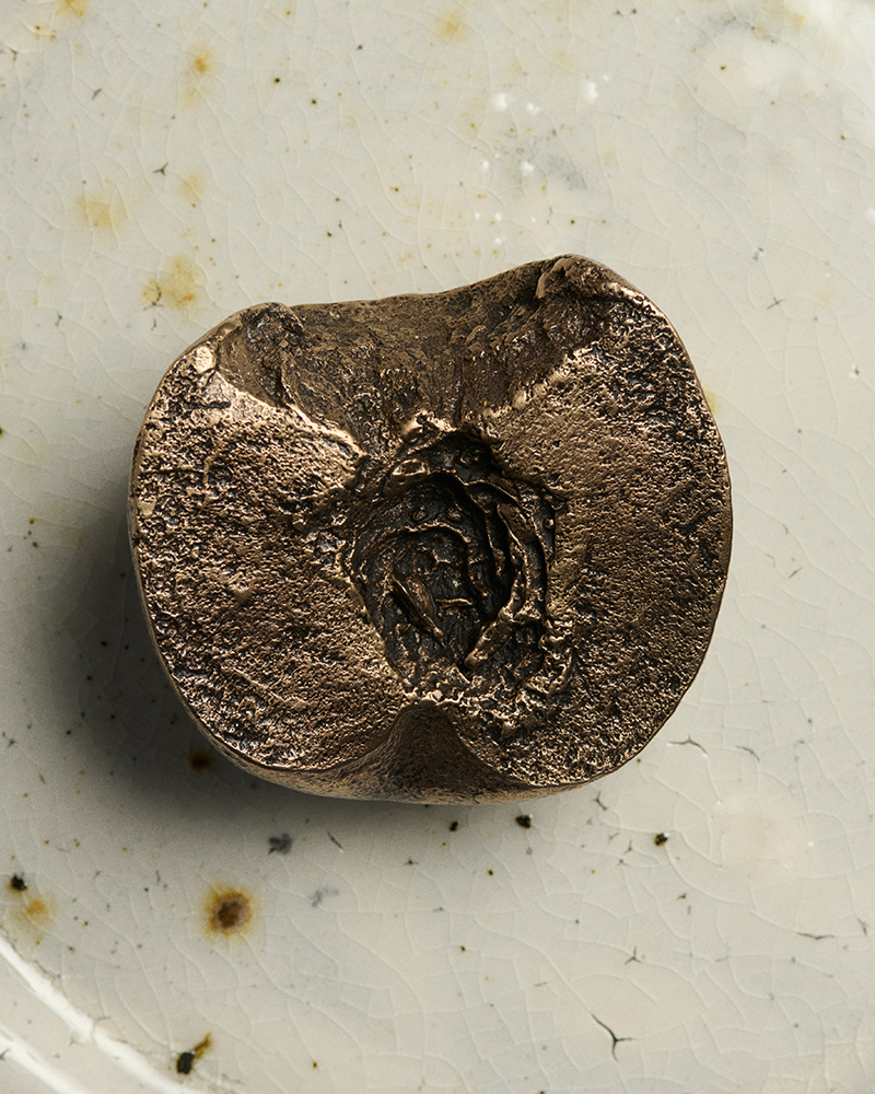 The idea came from Jonathan Anderson and Luca Guadagnino. The inspiration is a single, memorable scene from Guadagnino’s film, Call Me By Your Name. The object itself is straightforward in its origin. Each paperweight begins with a whole, real peach. A mold is made from the fruit. Molten bronze is poured into that mold.