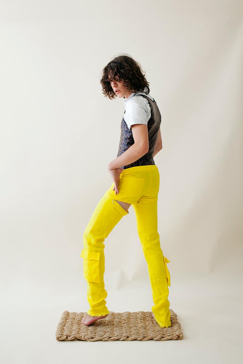 Dedicated to sex tourism, garments are built on the crossover between workwear and beachwear. Detachable cargo pants, hand-embellished souvenir T-shirts and front-laced shirts turn fashion into merchandise. Qualities range from the synthetic to the virgin: leopard spandex and metallic twill are combined with washed linen and raw denim.