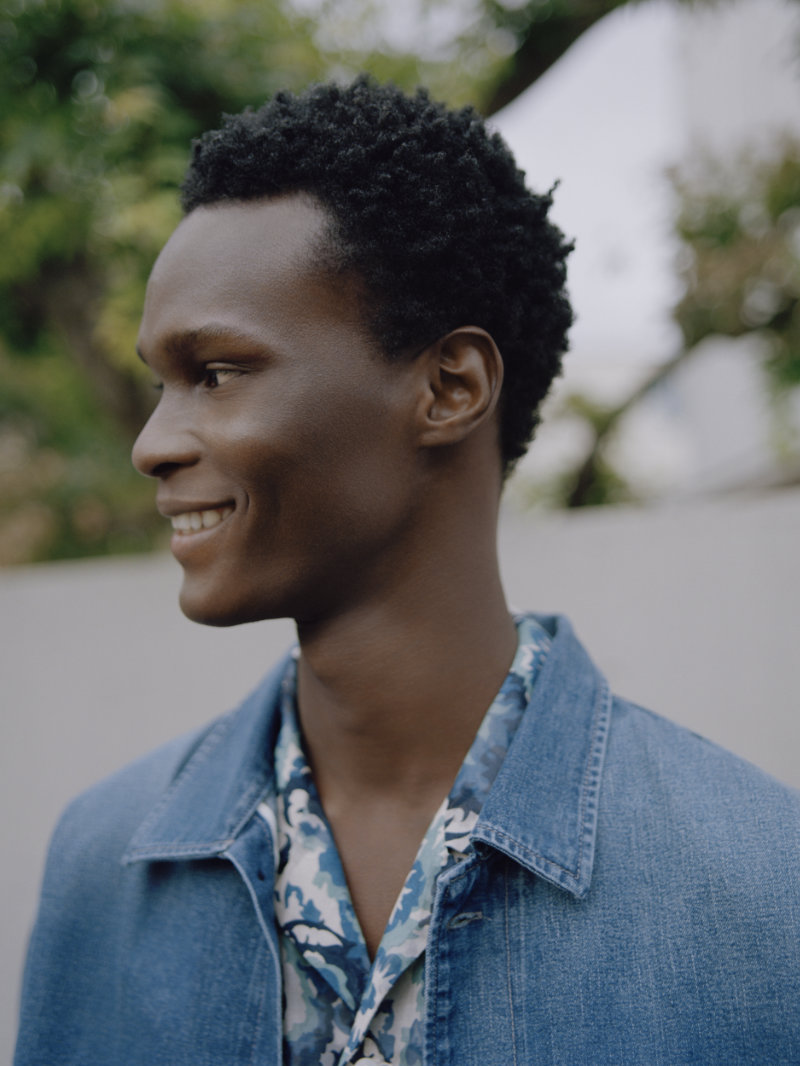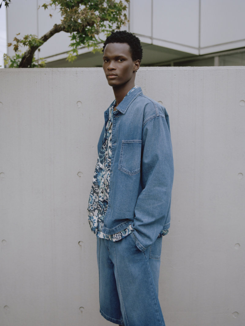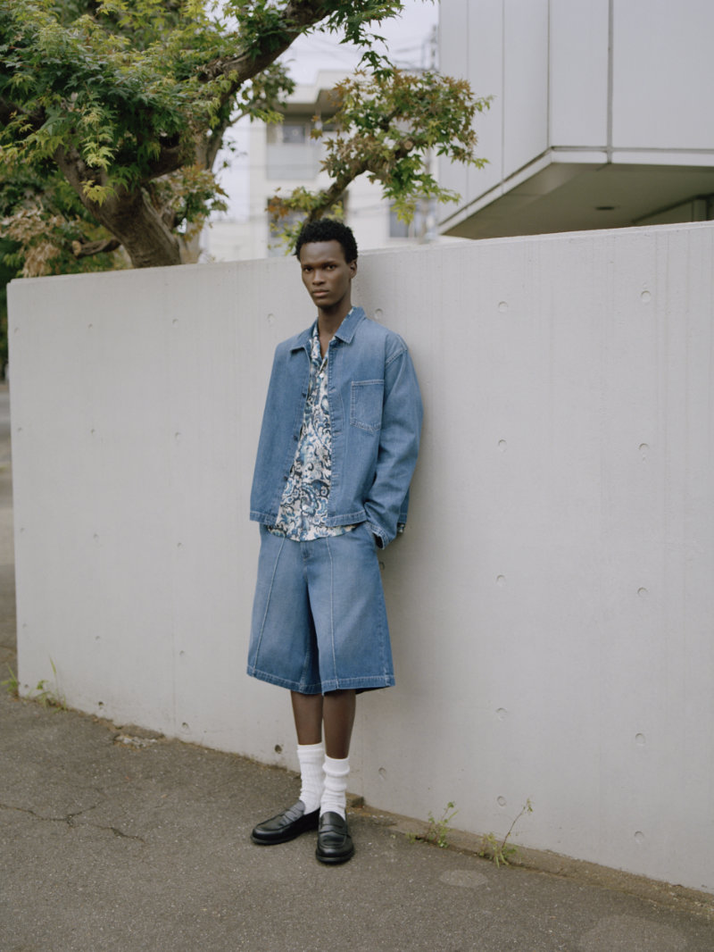 In menswear, the updates are noticeable. The 1980s 501 has inserted panels along the side seam, creating a fuller, more voluminous fit. The Sawtooth Shirt becomes a trucker-style jacket with shorter proportions. An Unstructured Jacket offers a deconstructed suit shape in Japanese indigo denim with a tweed-like texture. Pleated trousers arrive relaxed, meant to develop character over time. A silk-blend Camp Shirt carries an all-over print on semi-sheer fabric, paired with a 2-in-1 selvedge denim jacket and light gray weave shorts.