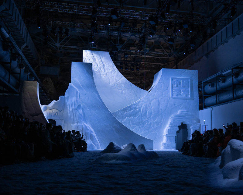 The show was designed as an immersive journey. Guests entered through a vintage alpine train station setting that evoked historic Olympic moments. The environment slowly transformed into a stark, white landscape inspired by snowfields, leading to the main show space designed like a winter sports arena.