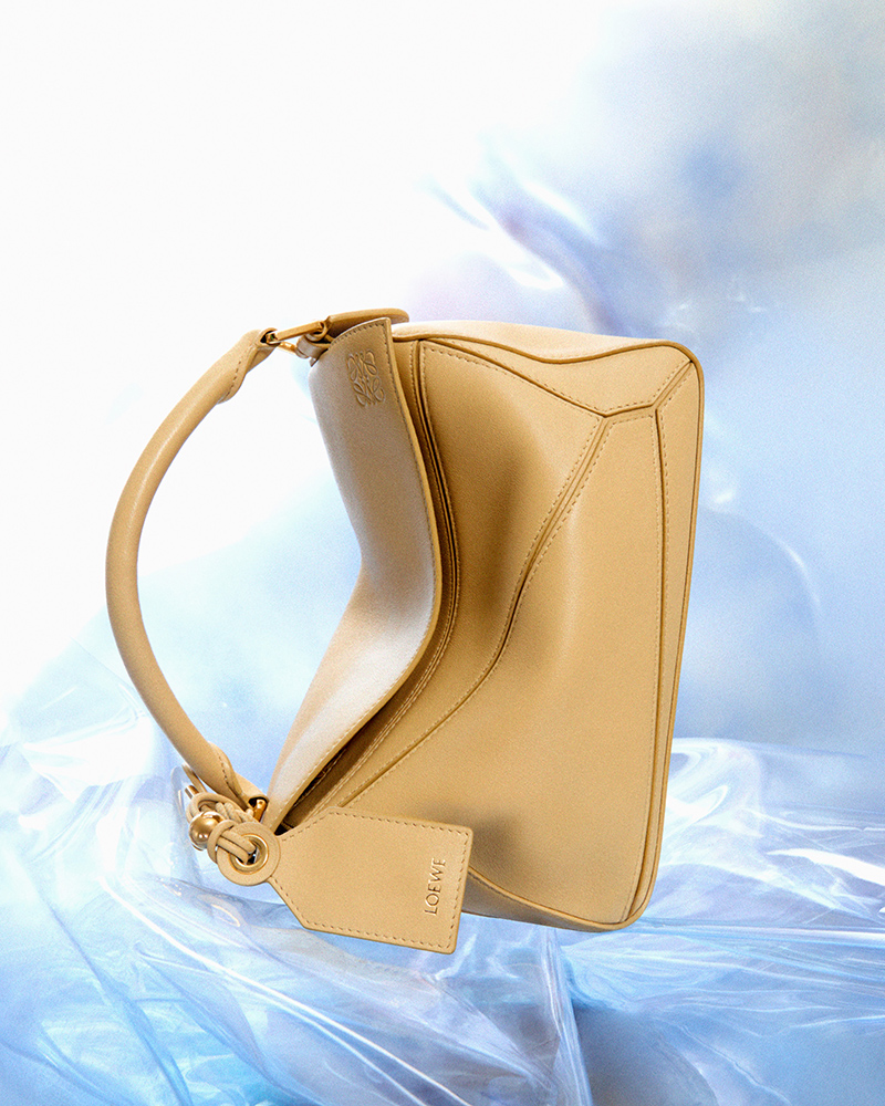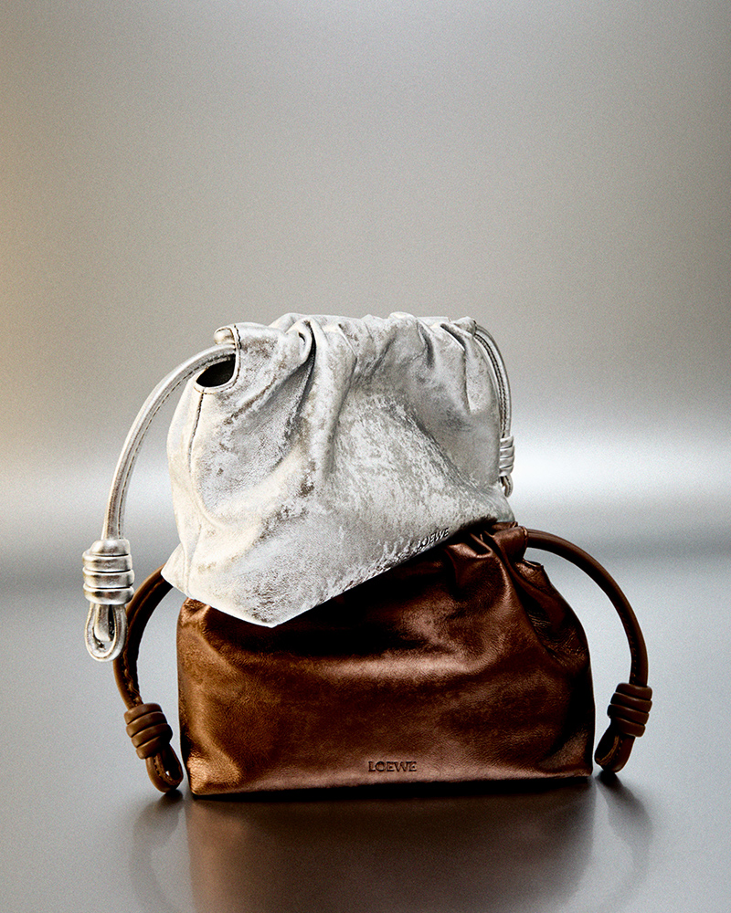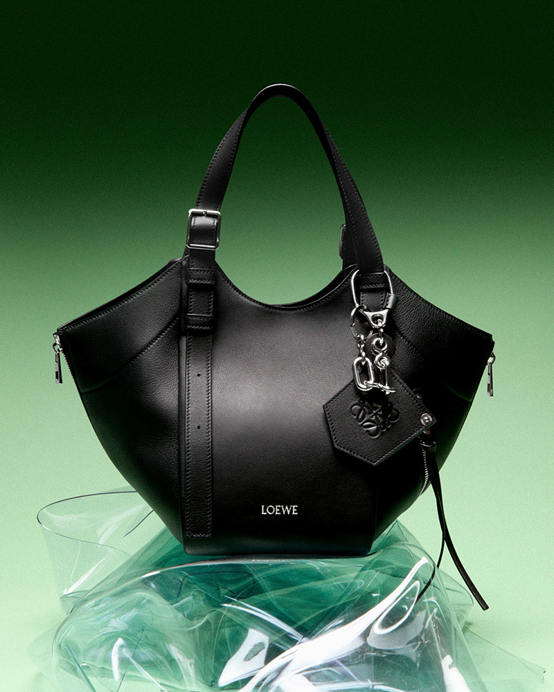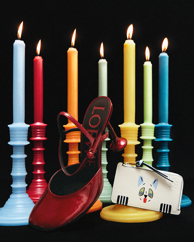 LOEWE’s Pre-Spring/Summer 2026 campaign, photographed by Carlijn Jacobs, is built on a clear visual energy. The images use vibrant color and festive metallics. The focus remains on the product itself, with light and simple backgrounds highlighting the texture and detail of each piece.