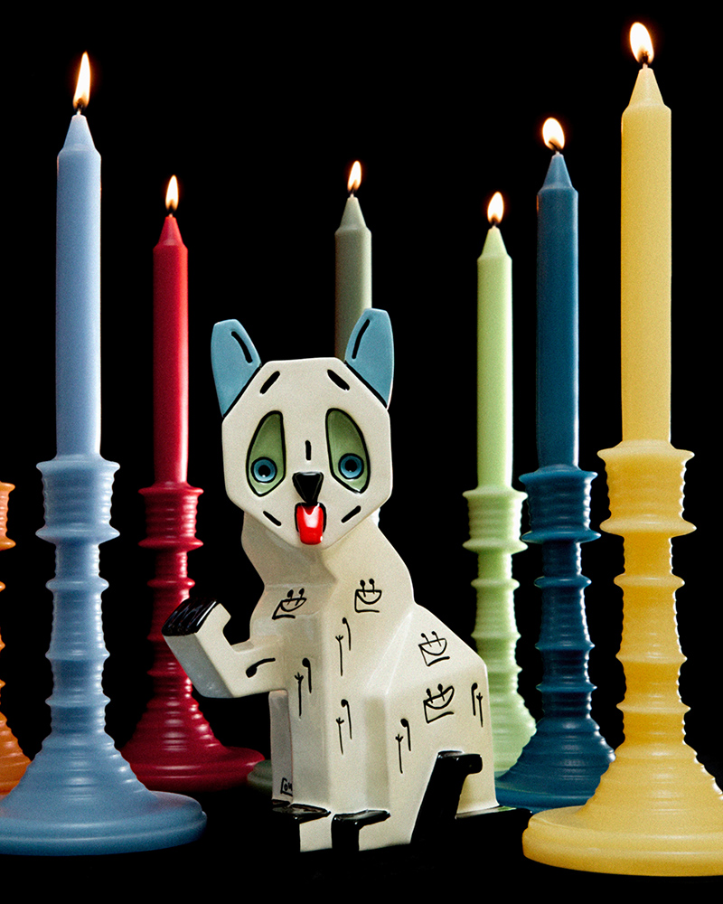 A central inspiration for the collection is the work of British artist Louis Wain. Known for his drawings of cats, Wain’s later work shifted toward abstraction, influenced by Cubism and Futurism. His “Futurist Cats” series, which featured geometric, colorful felines on porcelain vases, directly informs a capsule within the collection.