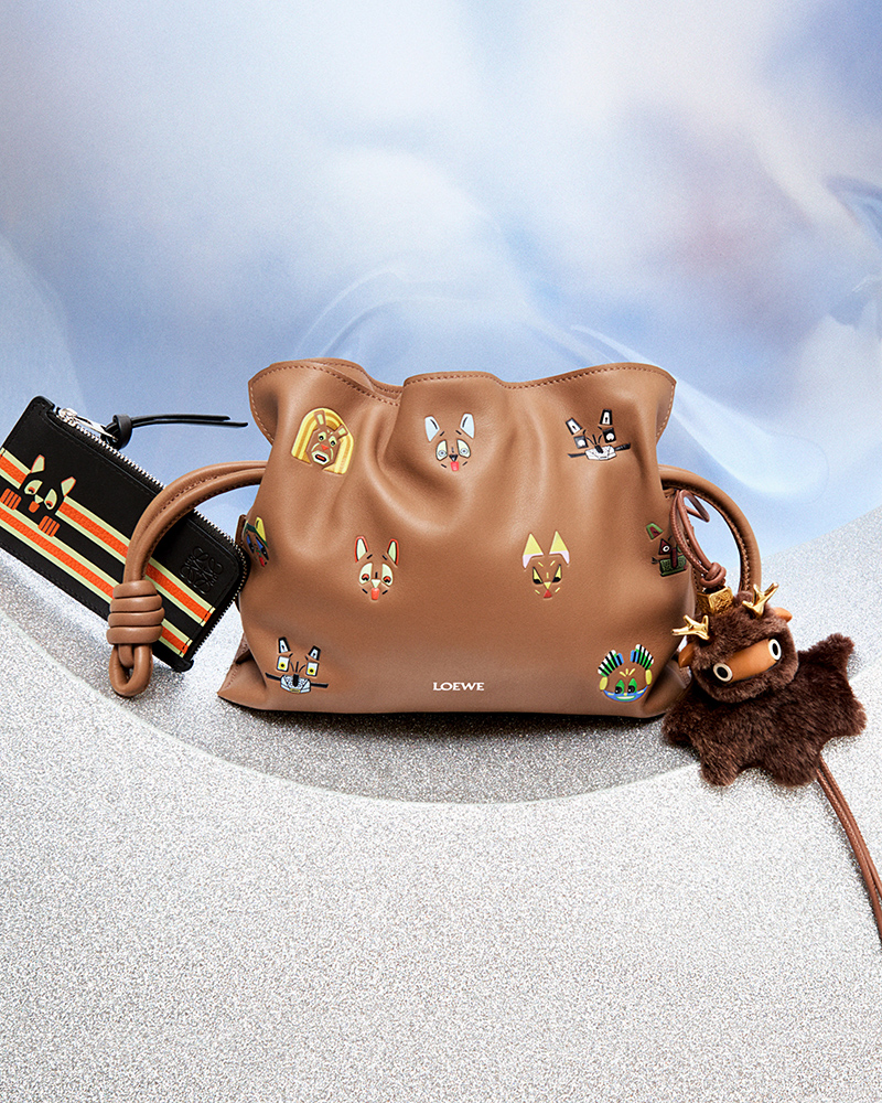 This inspiration appears across bags and accessories. Iconic styles like the Puzzle and Flamenco are decorated with cats through intarsia, embroidery, and prints. The Futurist Cat clutch bag reinterprets Wain’s vase designs in an architectural form. A new streamlined pouch, the Joya, offers a playful shape with a customizable element.