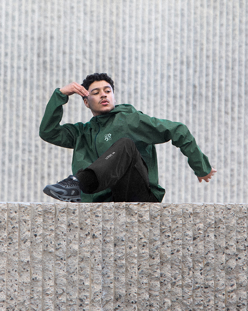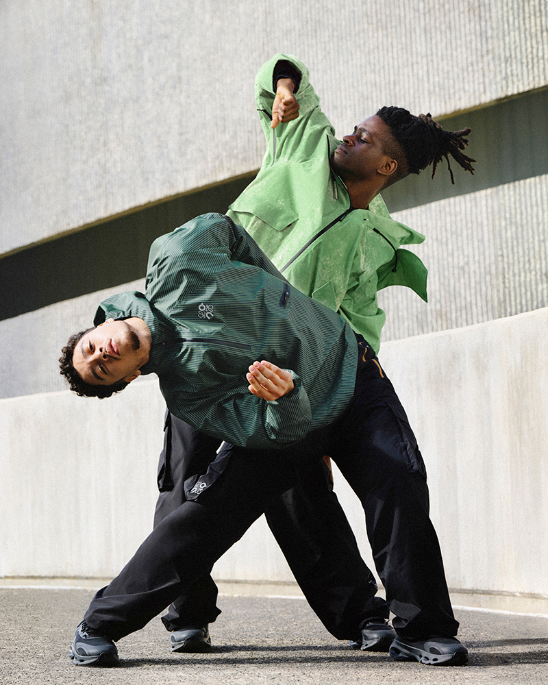 The collection’s clothing focuses on high-performance technology for the unpredictability of daily life. It includes a flocked anorak, cargo pants, and essential outerwear, alongside basics like sports bras and tees. Many pieces feature a new technical stripe developed by both brands.