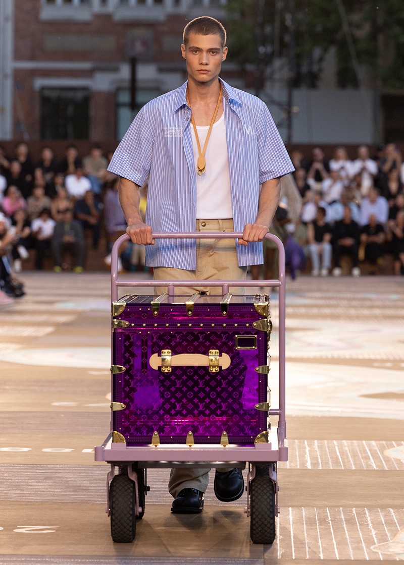 Reflecting on the codes of dandyism, the collection draws on the impact of contemporary Indian sartorialism with fabrics, cuts, colors, and craftsmanship that are influenced by a relationship to the city, the natural world, and the sun’s vibrancy. The idea of a global community bound by a love of discernment, savoir-faire, and adventure is at the core of Louis Vuitton as a house of travel.