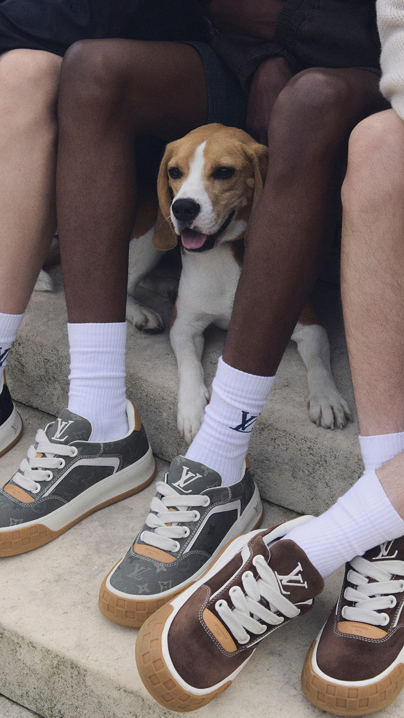 This is complemented by matching pieces like jeans and flannel trousers, as well as hybrid styles. A windbreaker gets leather sleeves, a blouse is made from tweed, and a quilted waistcoat features the Monogram. The LV Title sneakers revive a 90s skate style, while the LV Touch bags showcase soft, grained calfskin suede.