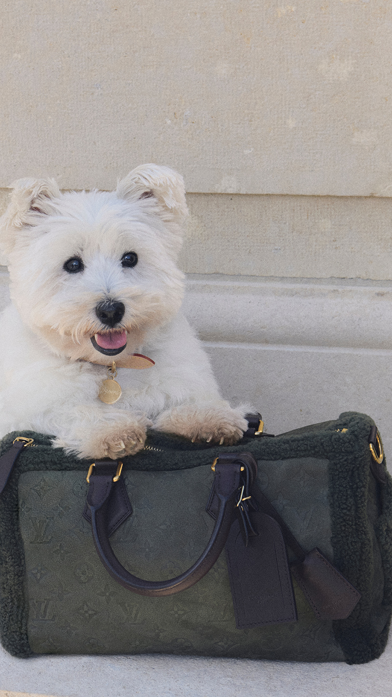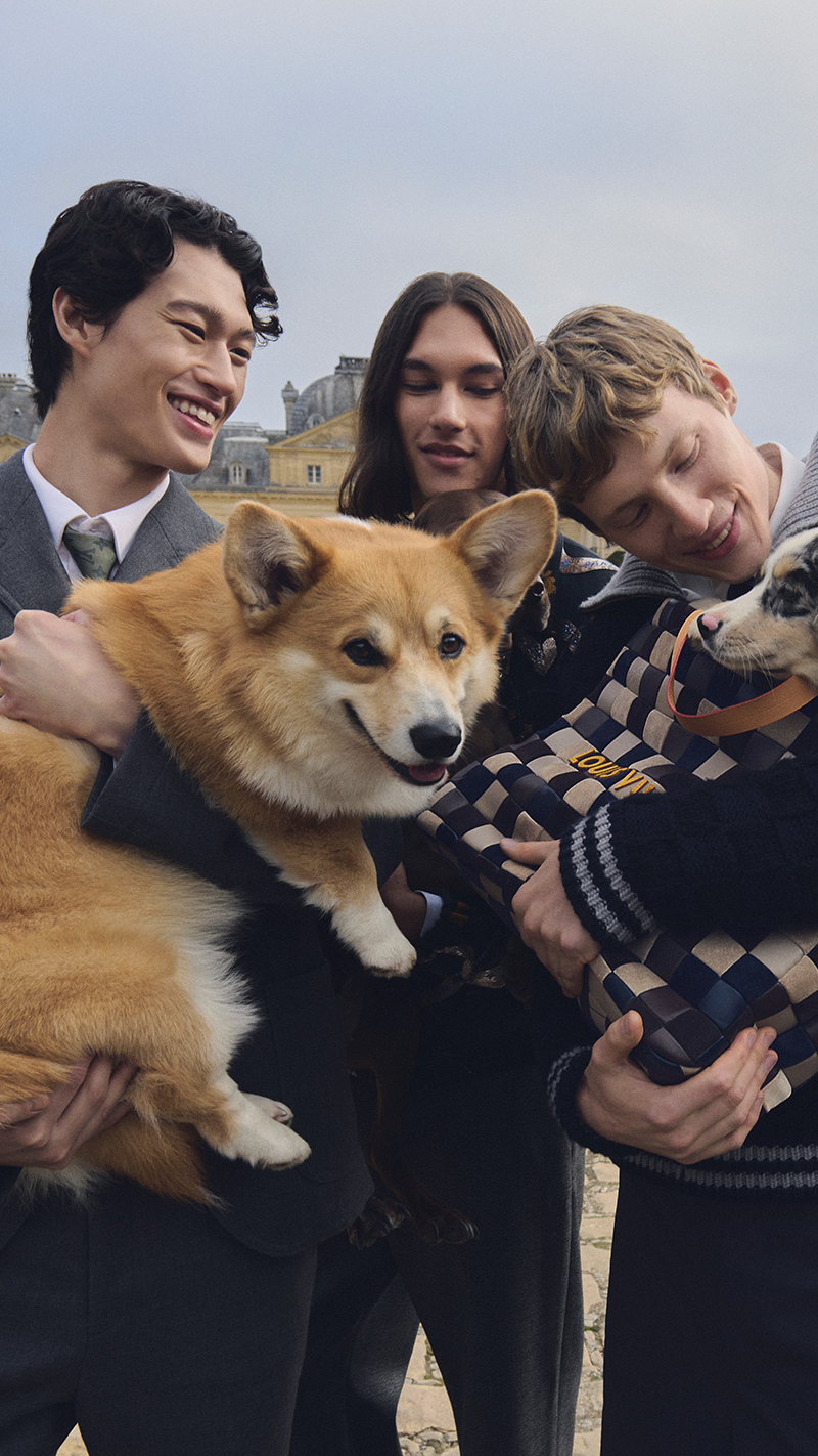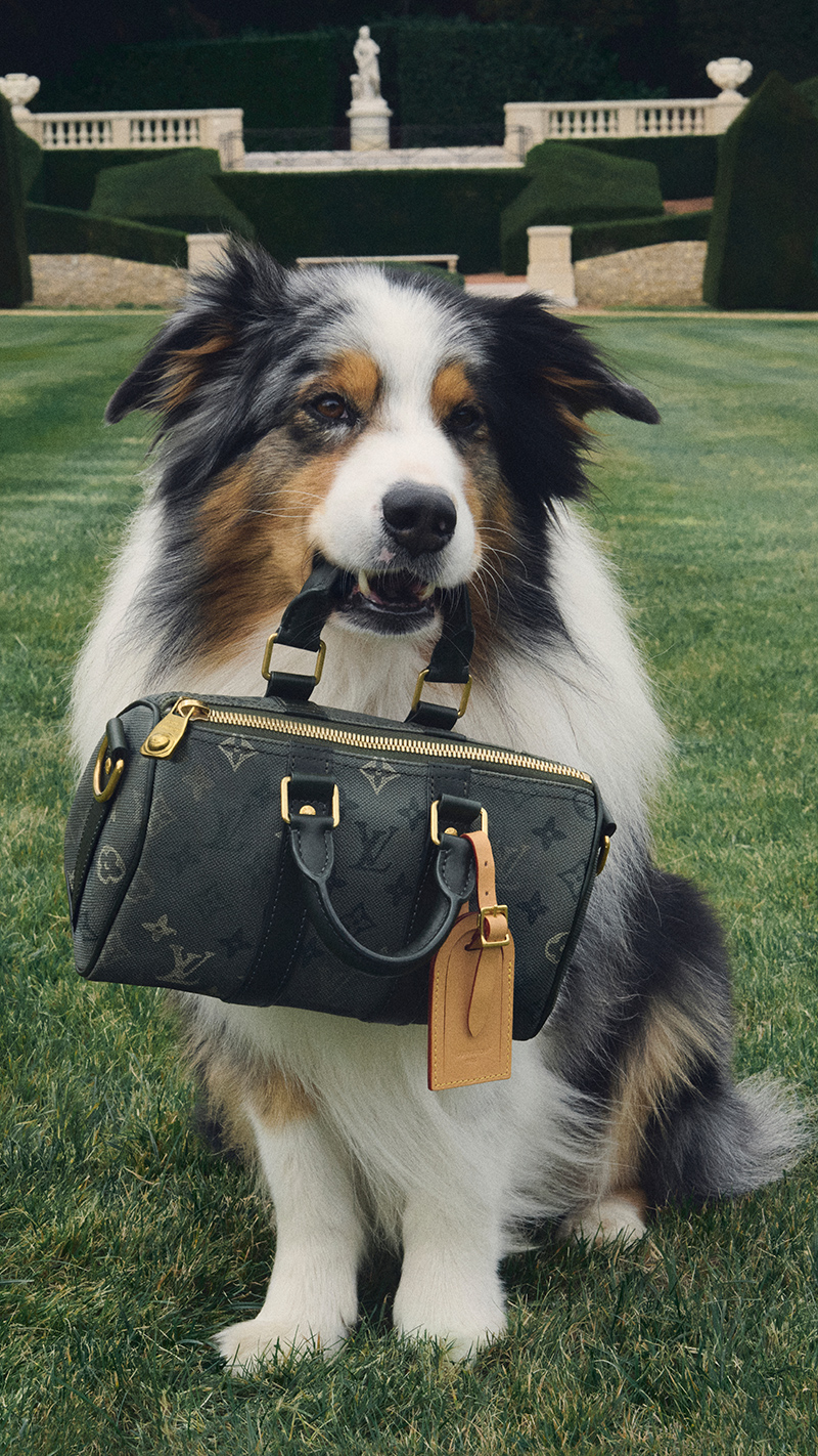 A full capsule for pets is also featured, modeled by Welsh Corgis and Border Collies. It includes leashes, down jackets, and travel bags like the Speedy Pet trunk and the Kennel trunk, all marked with the Monogram.