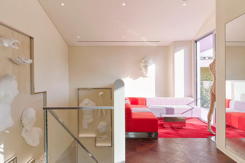 The changing rooms are cocoons of red velvet. Sculptural staircases become theatrical installations. Outdoor terraces with plants and stone extend the experience into nature, reflecting the brand’s commitment to a harmonious relationship with the environment.