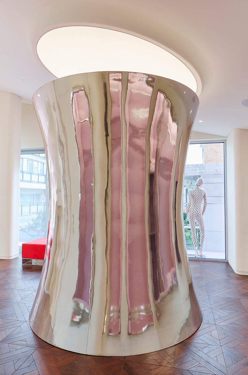 The journey starts at the entrance, a monumental gateway shaped like a crescent moon. Made from mirror-polished steel, it acts as a threshold, separating the everyday world from the universe of Marine Serre. Upon entering, a distinct scent envelops guests, marking the start of their transformation.