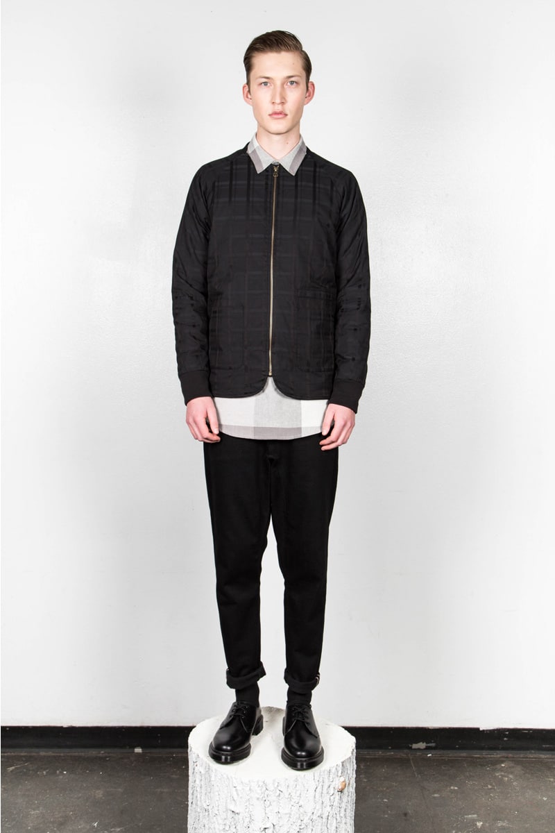 Mixed fabrications reflect the blend of cultural inspirations, from the edgelands of England to the cityscapes of New York. This duality between the natural and the urban is expressed through the use of materials on modern silhouettes. Specialty wools fashion a large part of the collection. Italian virgin wool and woolen gauze plaids provide both texture and warmth, while soft comfort comes in the form of cashmere, Kid Mohair and crinkled jersey. Varied weights and layered styling play a crucial role in the collection, enabling the traveler to adapt to his next adventure.