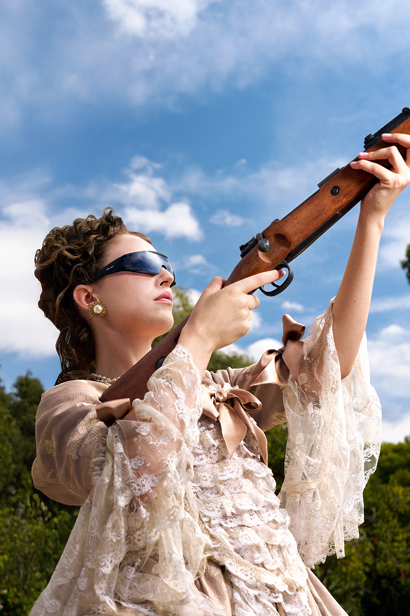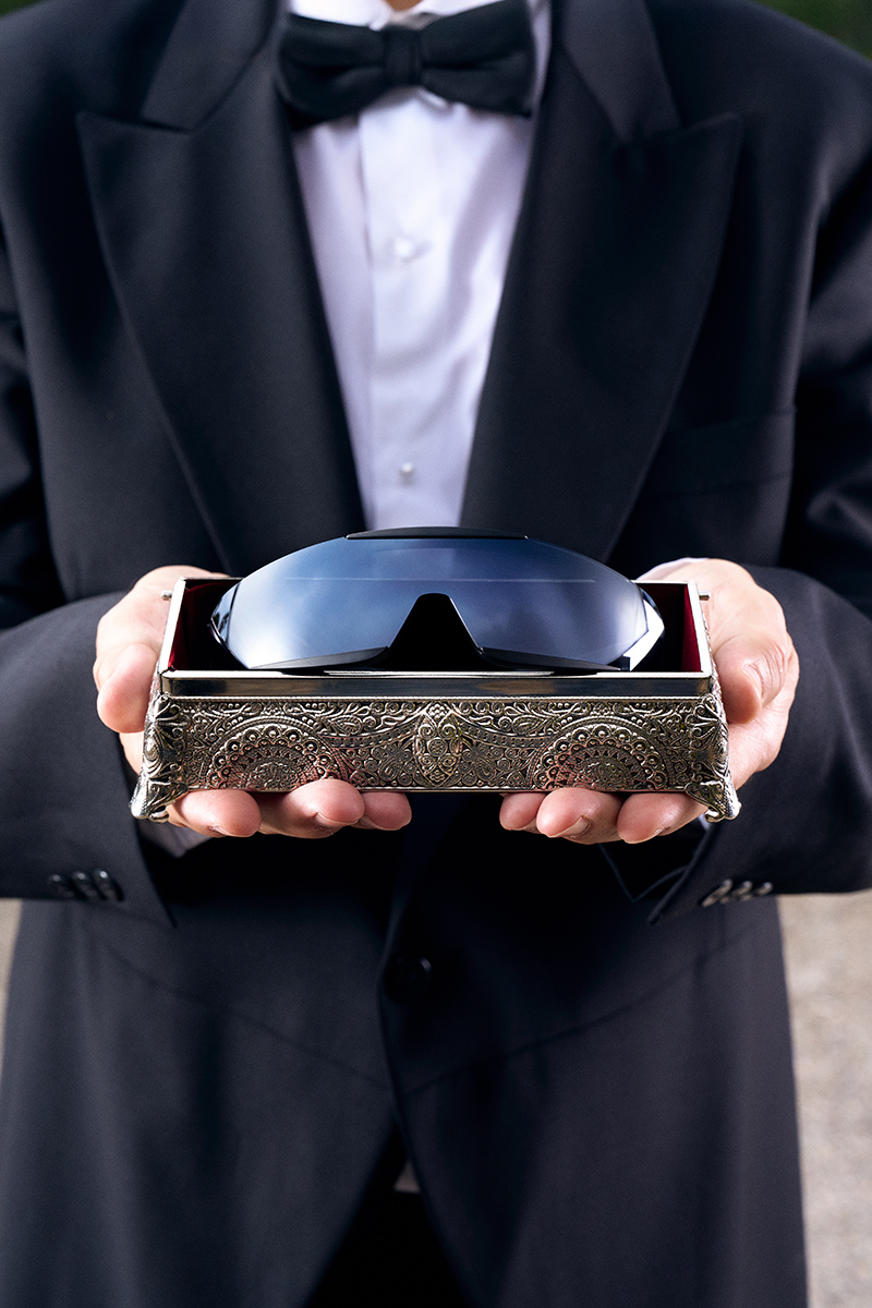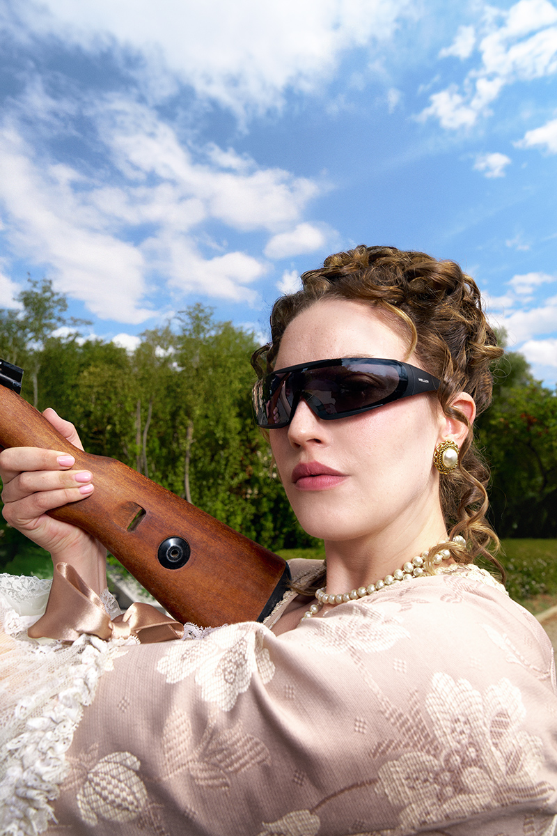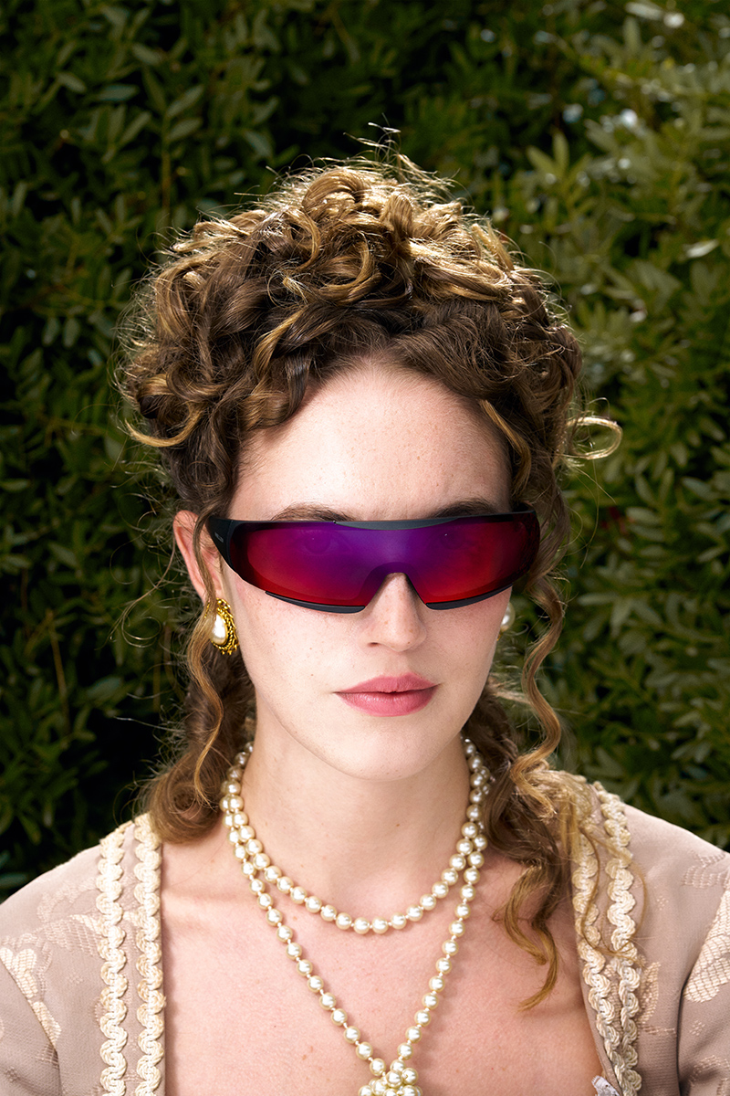 These are not classic shapes. They are wrap-around shades with a futuristic, aerodynamic design. They are made for someone who moves between eras, with one foot in the past and one step into the future. They bring a modern energy to a timeless setting.