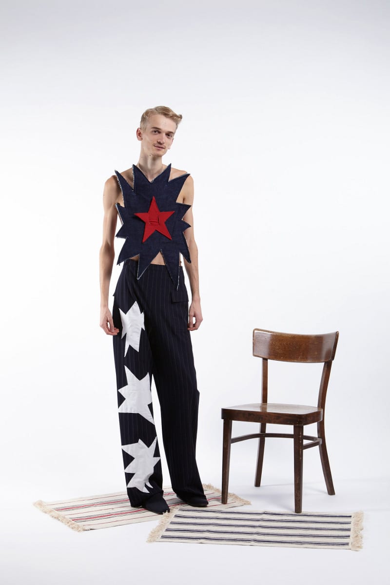 For this collection the two designers work completely isolated from each other. Each create a beforehand discussed amount of garments which will only meet the day of the lookbook shooting. The only thing constant between these individual pieces is the colour: red, white and blue (coming from the flags of the countries where the two designers were living: Iceland and France) and black/grey to create a shadow between the colours.