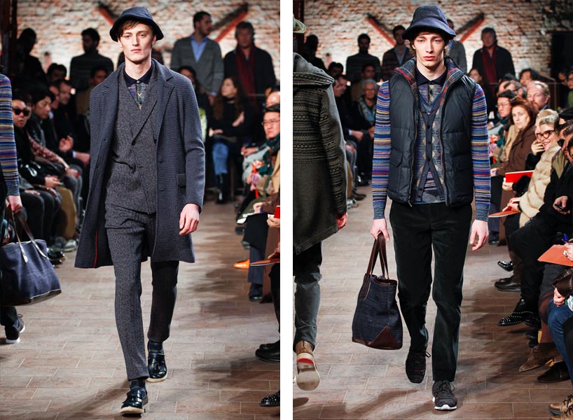 Missoni‘s menswear looks for next Fall/Winter featured beautiful knitwear pieces, and great details like the large billed caps and necklaces of small crochet circles that integrate with the crew neckline.